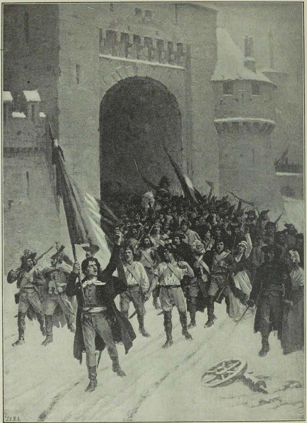 DEN FRANSKE REVOLUTION. De Frivillige drager ud ad Strassburgs Port 1792. Efter Maleri af P. A. Baudouin. |