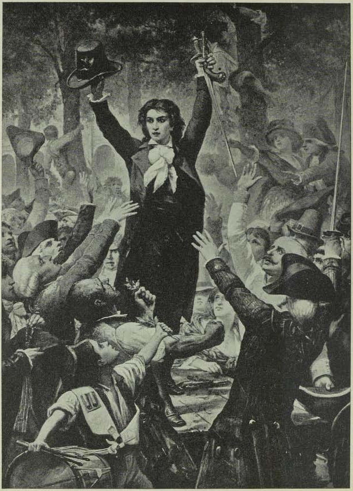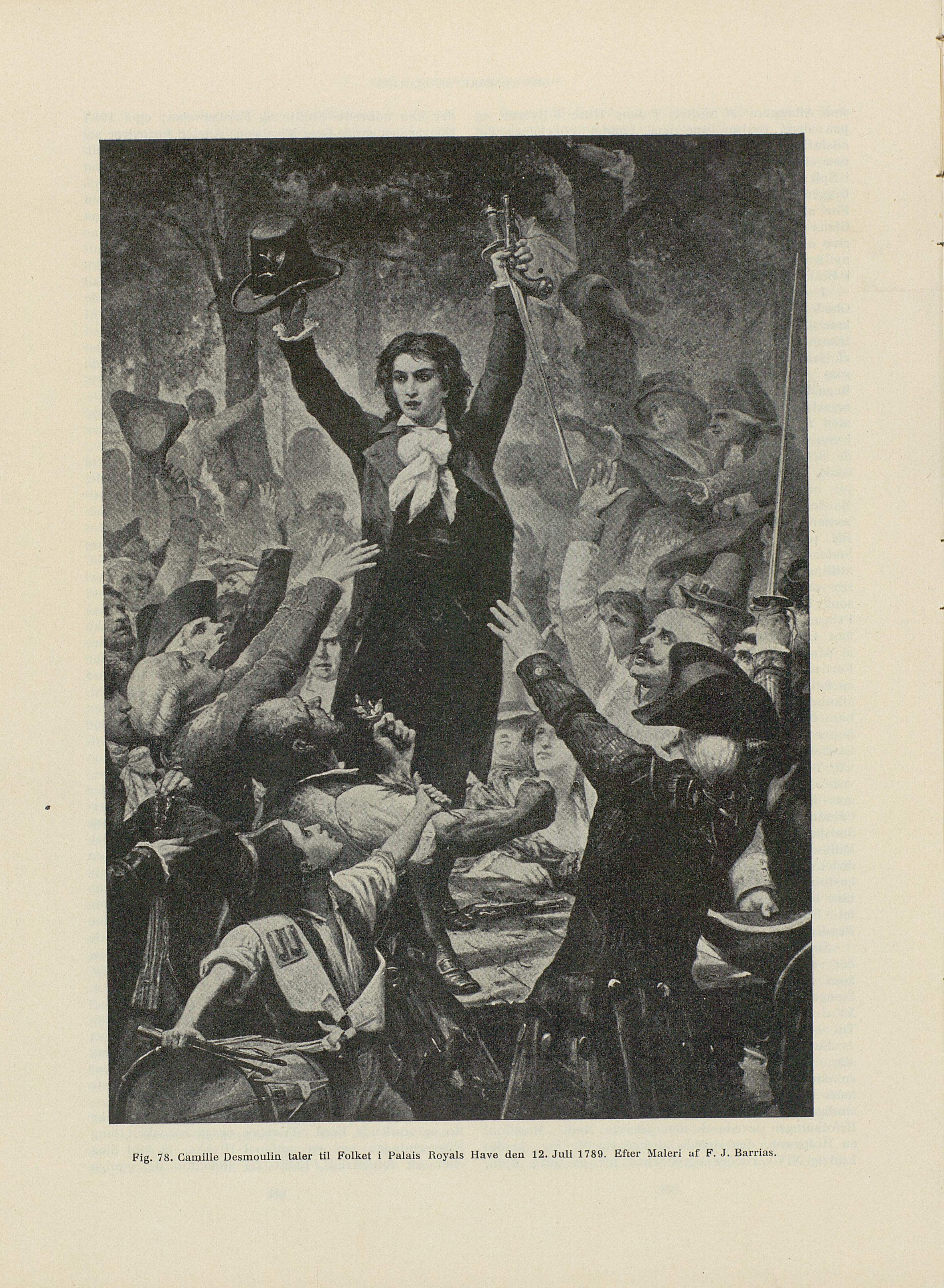 Fig. 78. Camille Desmoulin taler til Folket i Palais Royals Have den 12. Juli 1789. Efter Maleri af F. J. Barrias. |