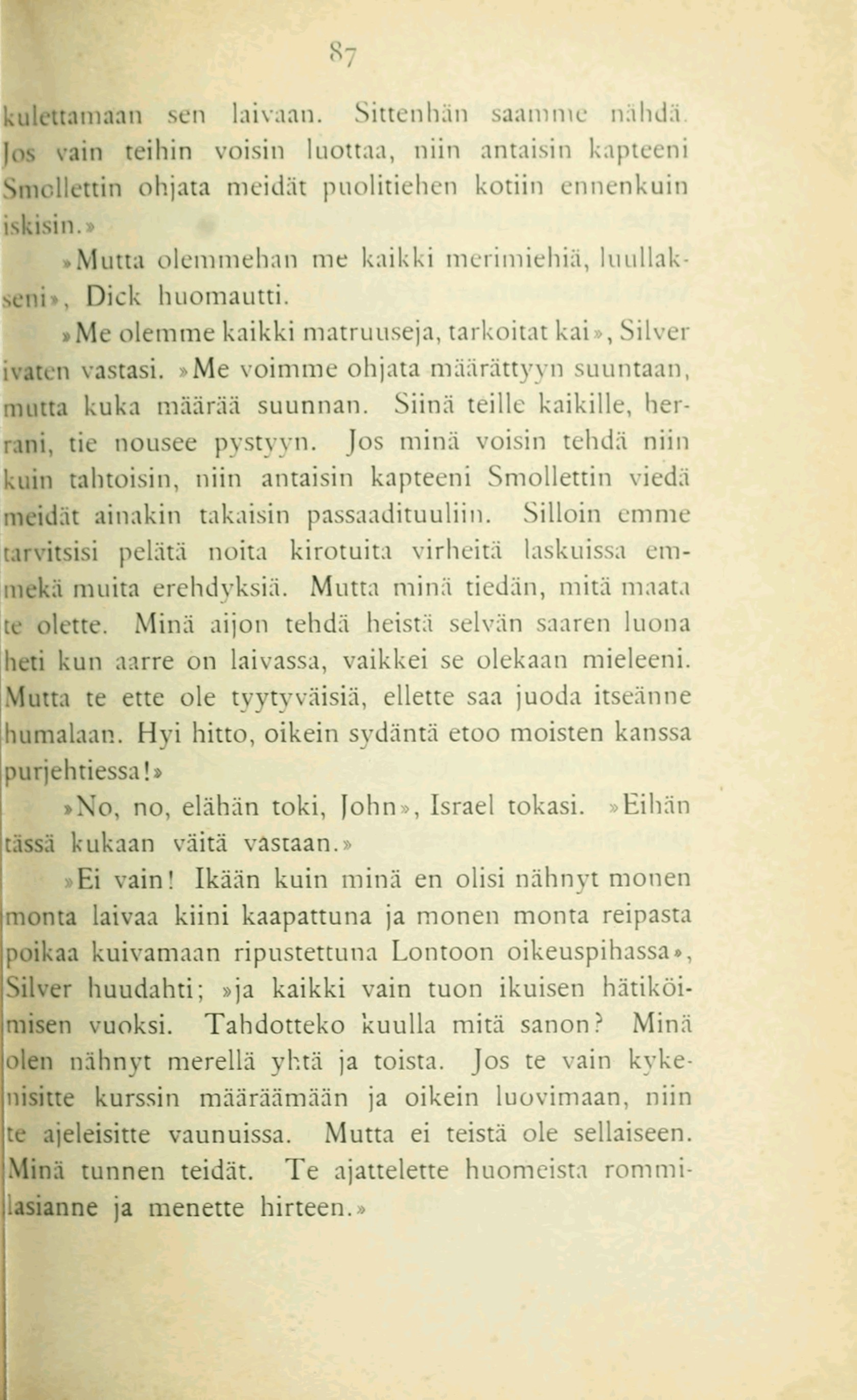 »No, no, elähän toki, John», Israel tokasi. »Eihän