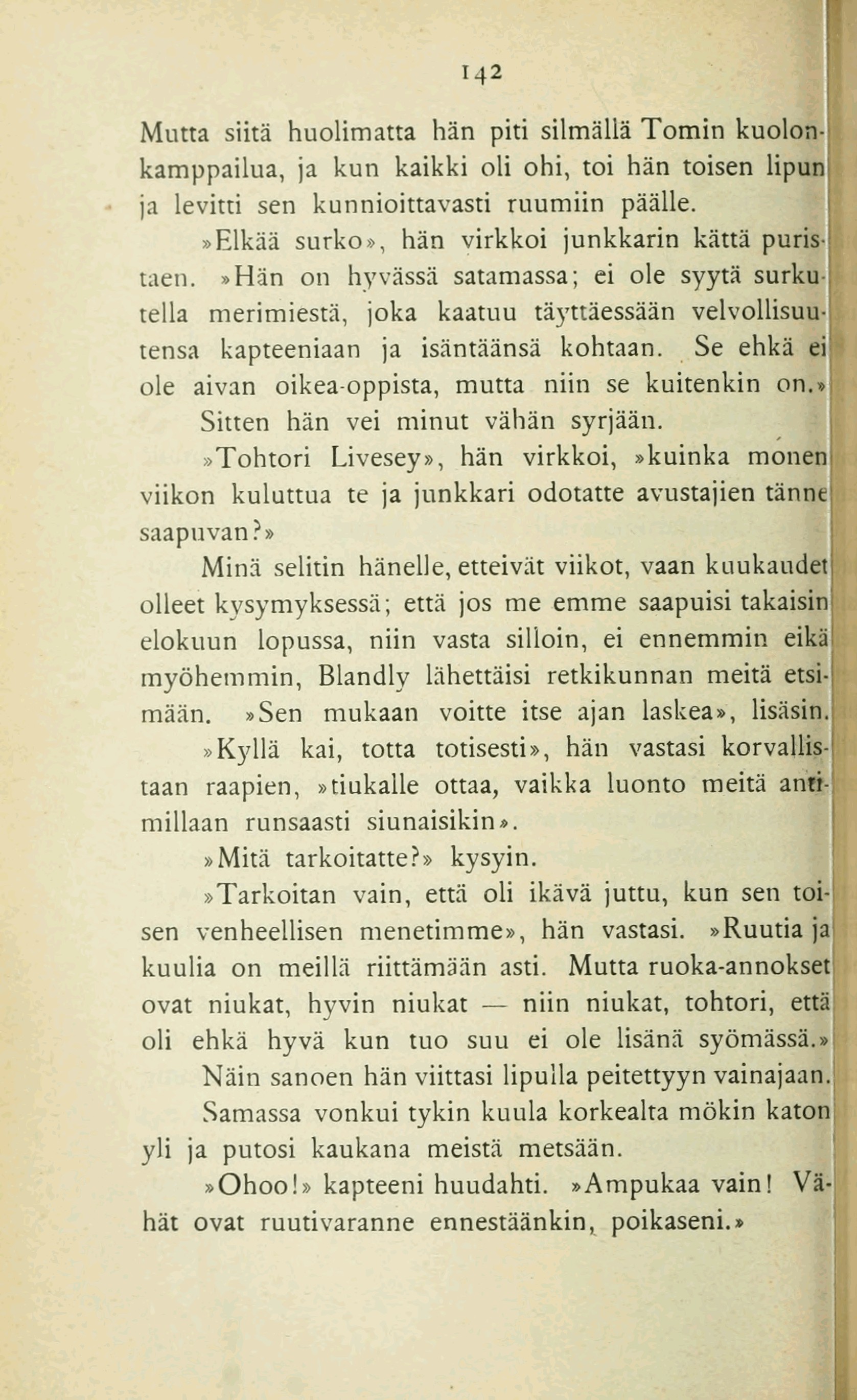 »Tohtori Livesey», hän virkkoi, »kuinka monen