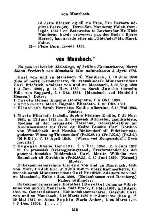 Johan Frederik von Mansbach blev naturaliseret 3 April 1776.