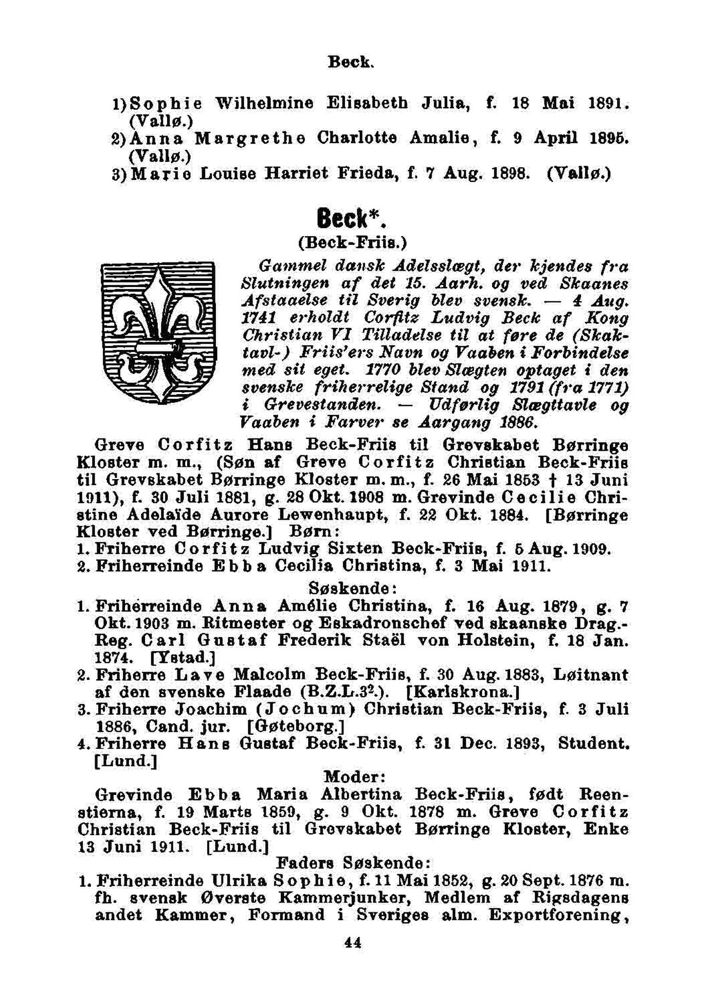 1. Friherre Corfitz Ludvig Sixten Beck-Friis, f. 5 Aug. 1909.