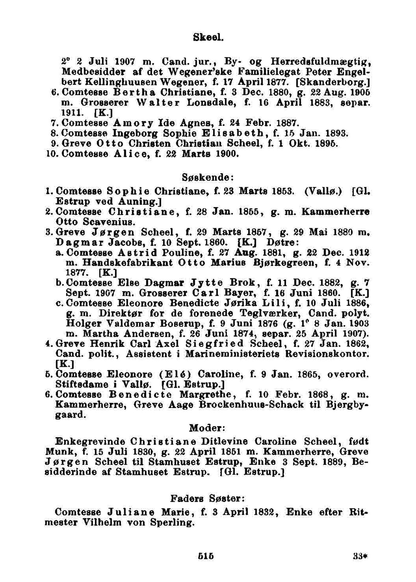 3. Greve Jørgen Scheel, f. 29 Marts 1857, g. 29 Mai 1889 m,