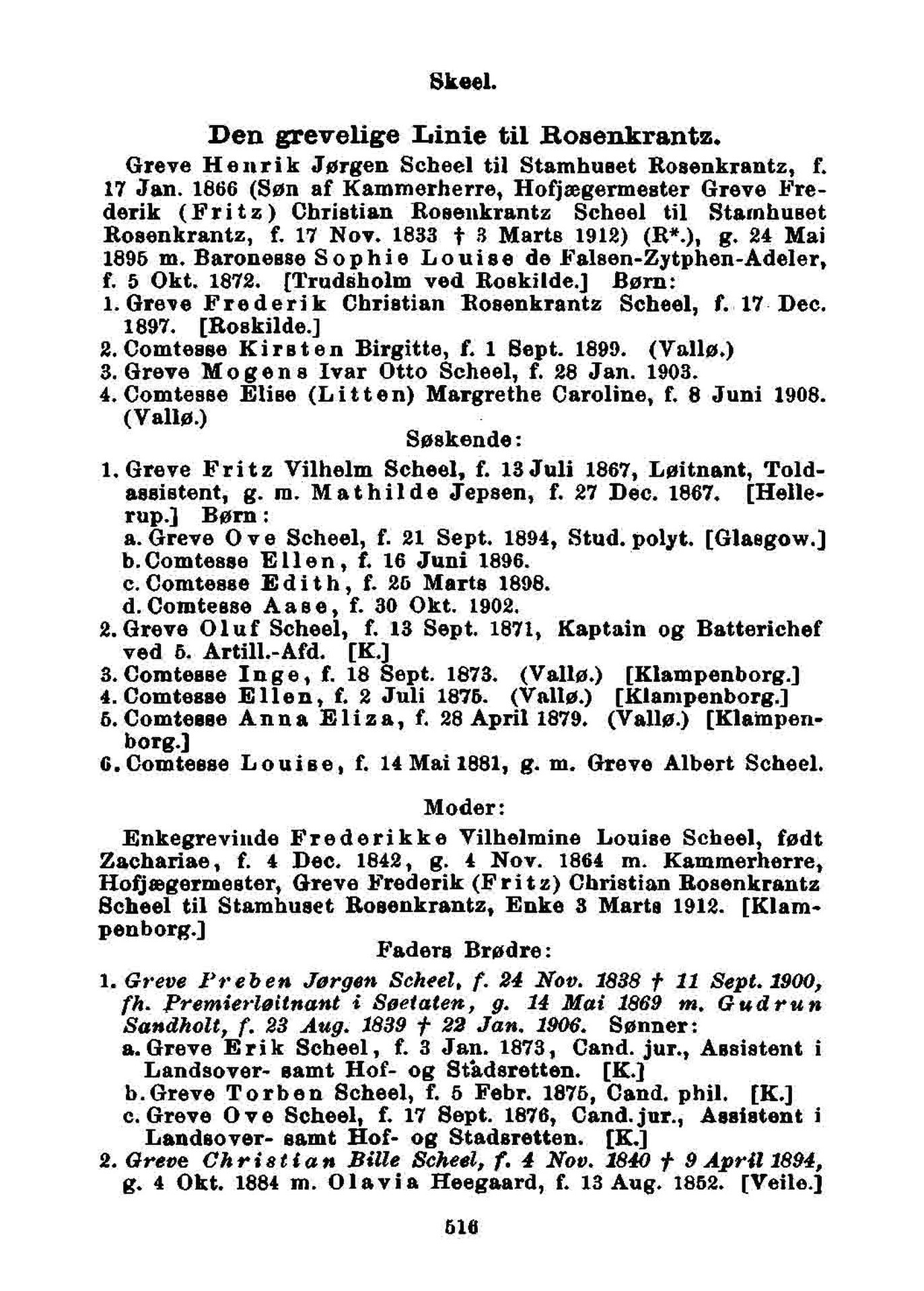 1. Greve Preben Jørgen Scheel, f. 24 Nov. 1888 f 11 Sept. 1900,