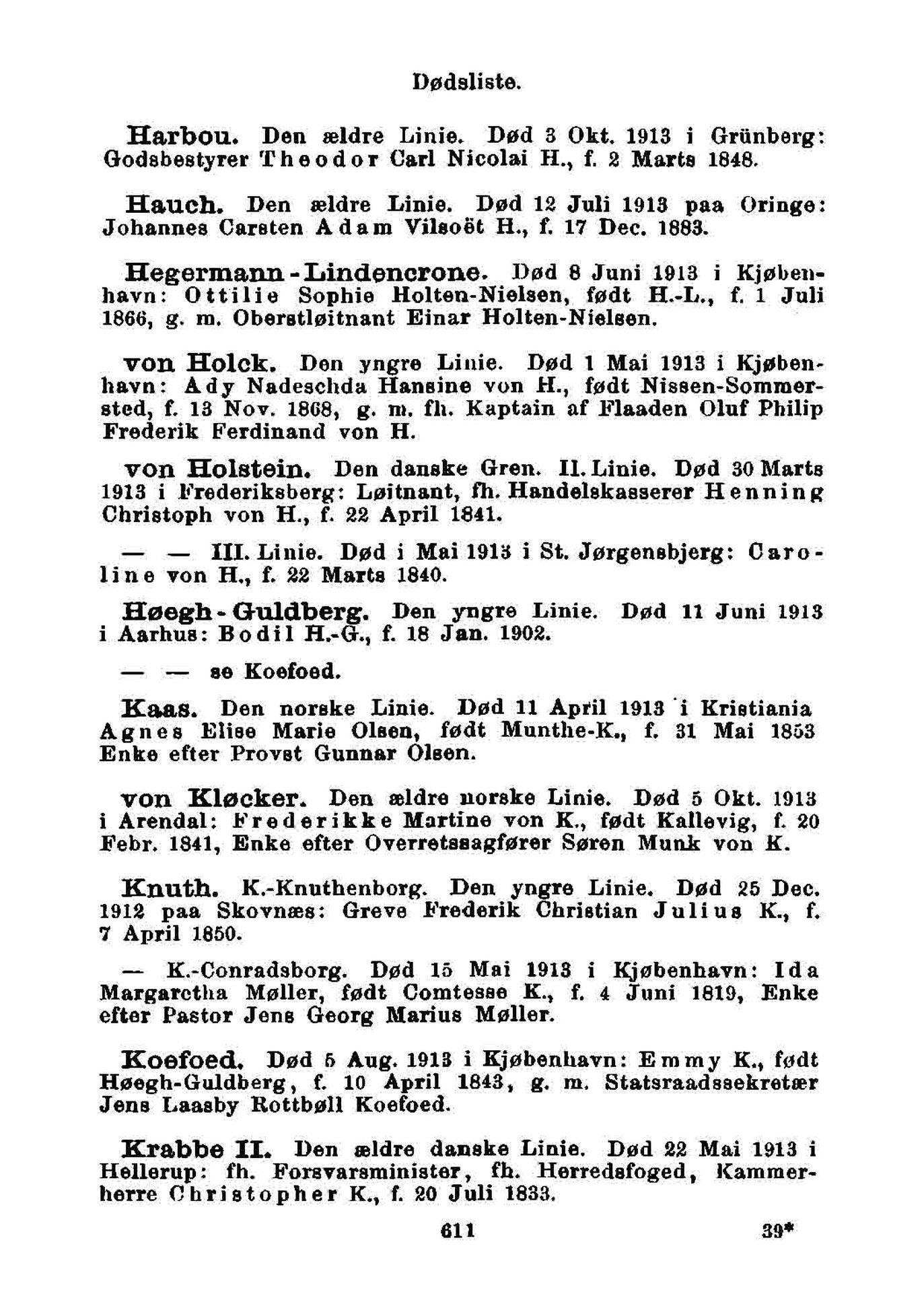 von Holck. Den yngre Linie. Død 1 Mai 1913 i Kjøben-