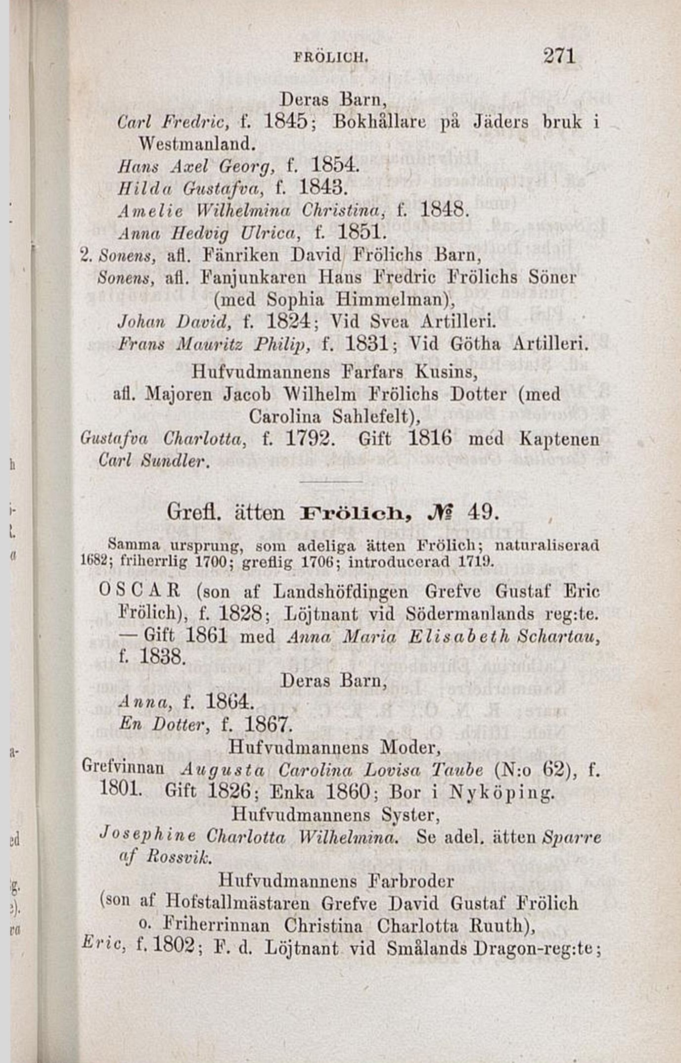 Frölich), f. 1828; Löjtnant vid Södermanlands reg:te.