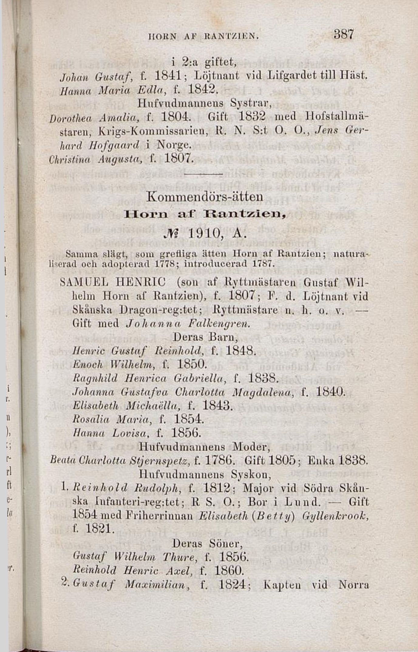 Wilhelm Horn af Rantzien), f. 1807; F. d. Löjtnant vid