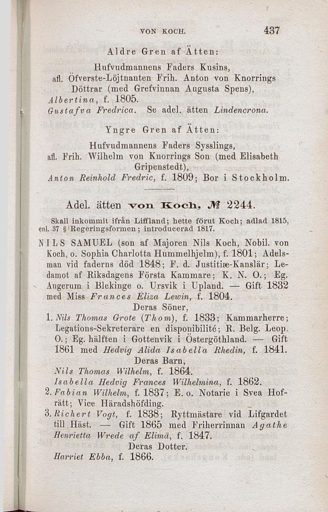 Skall inkommit ifrån Litfland; hette förut Koch; adlad 1815,