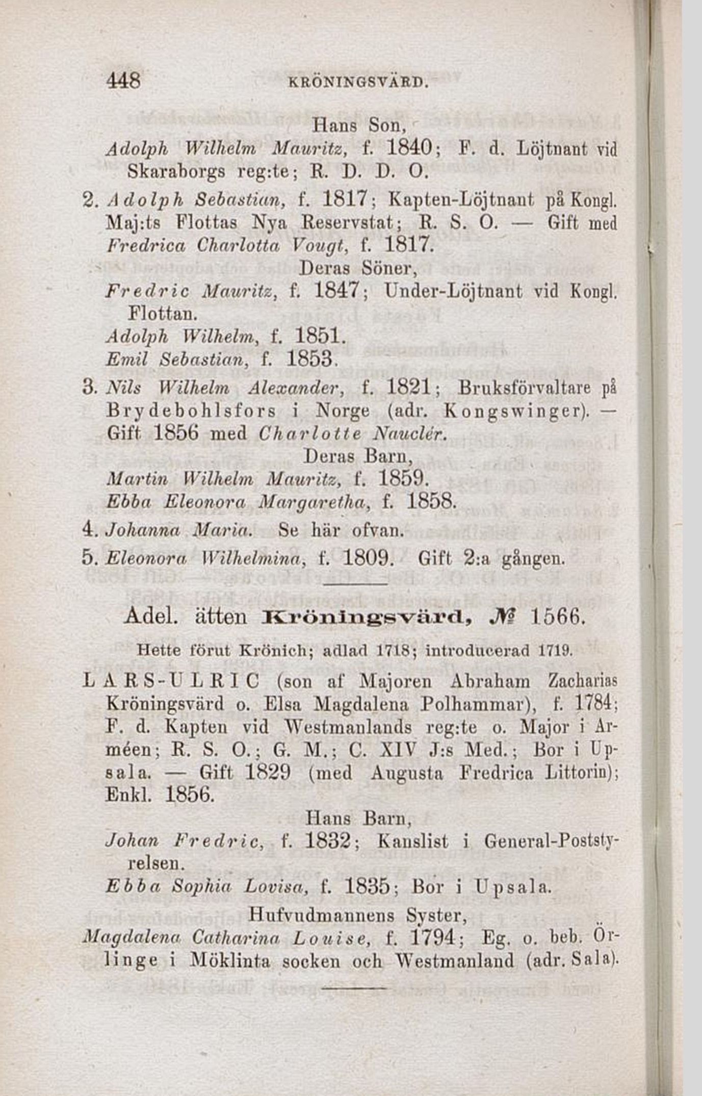 2. Adolph Sebastian, f. 1817; Kapten-Löjtnant, pä Kongl.