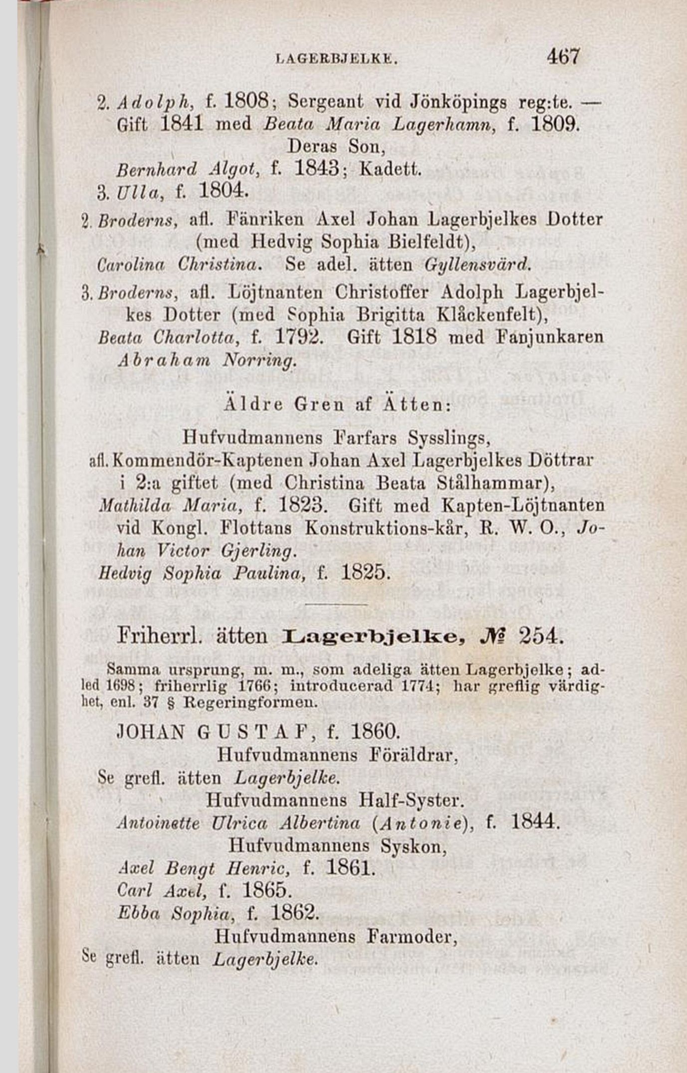Friherrl. ätten Lagerbjelke, JVI 254.