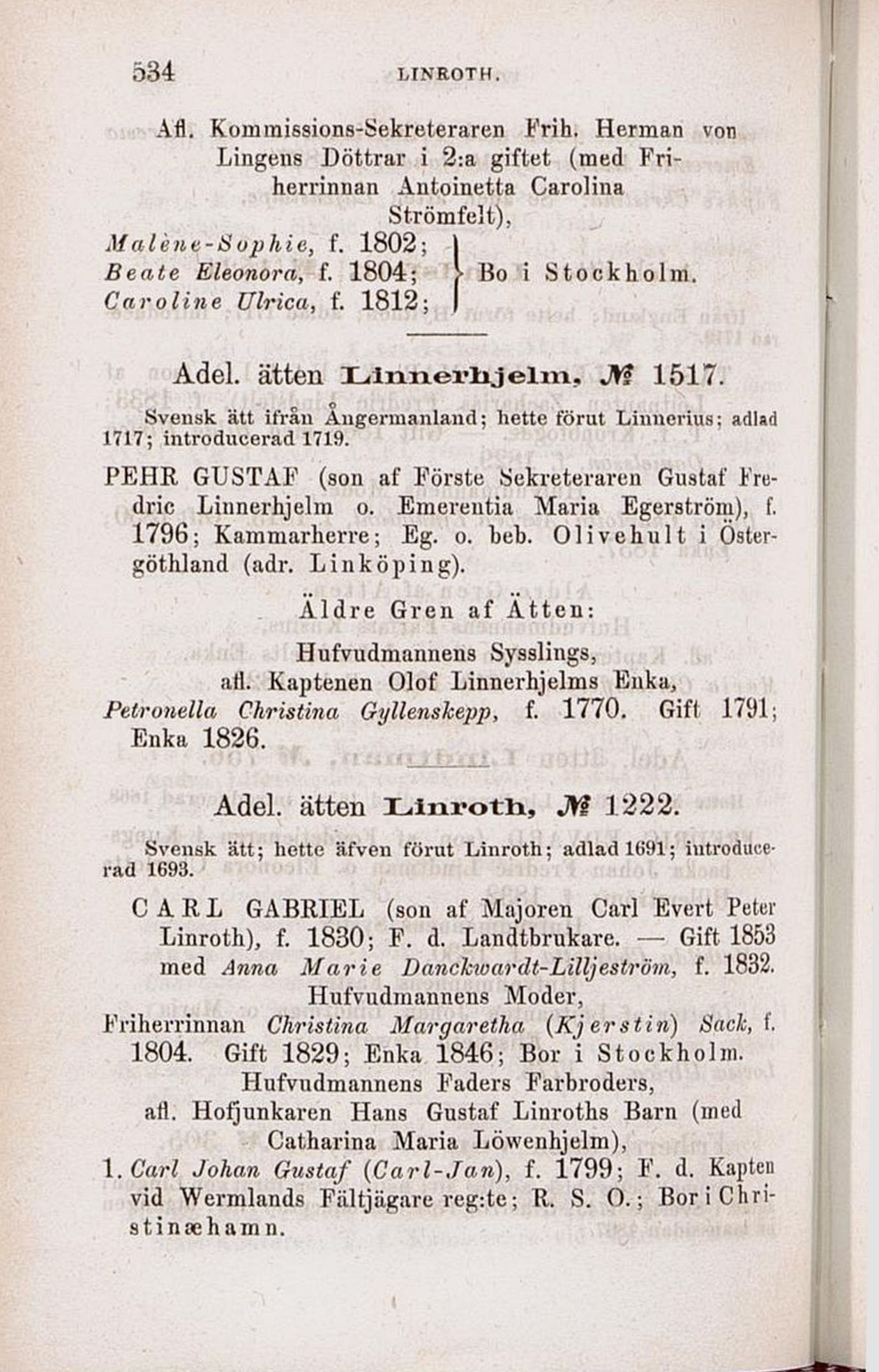 Svensk ätt; hette äfven förut Linroth; adlad 1691;
