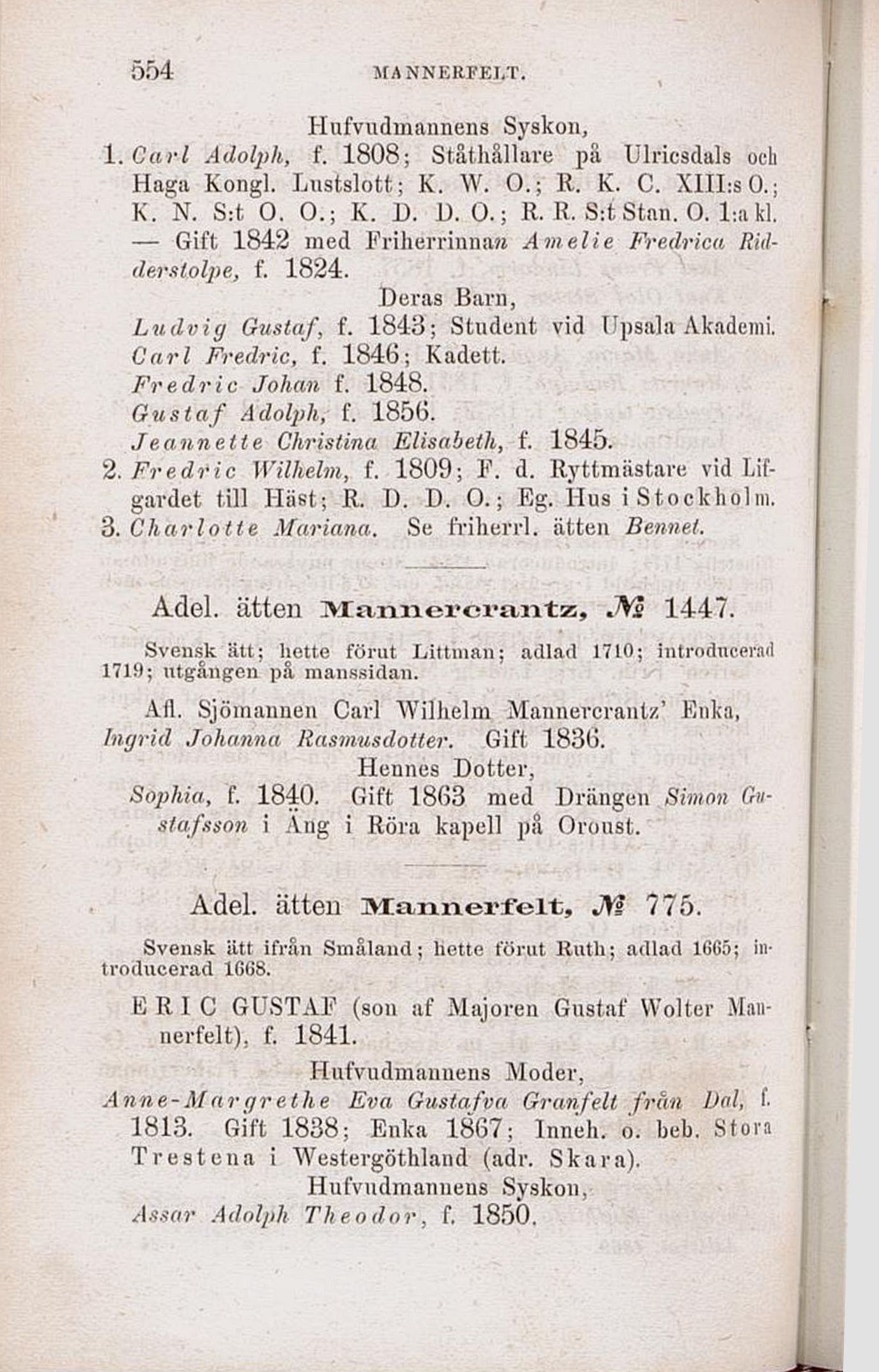 1. Carl Adolph, f. 1808; Ståthållare pä Ulricsdals och