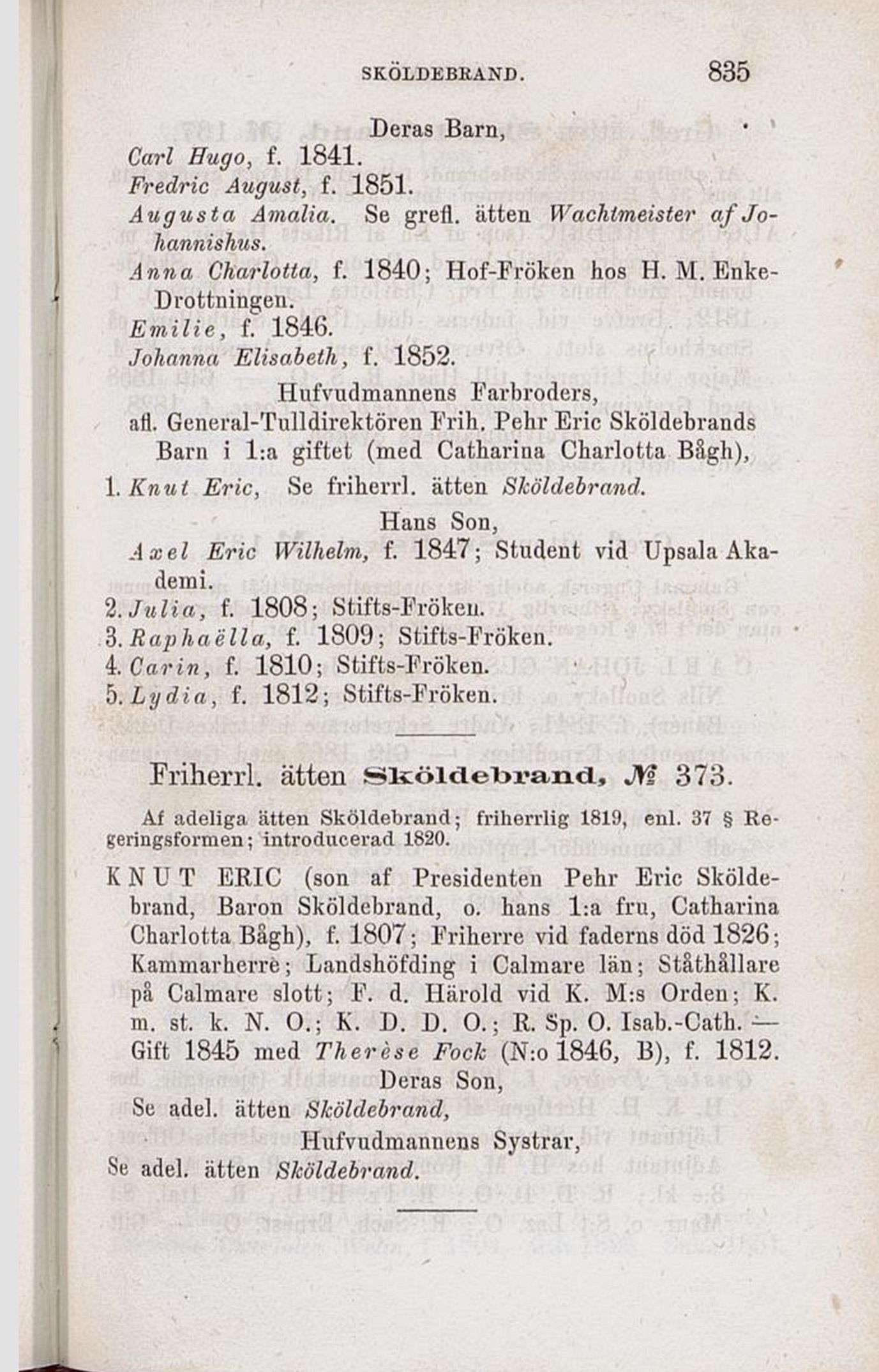 Af adeliga ätten Sköldebrand; friherrlig 1819, enl. 37 §