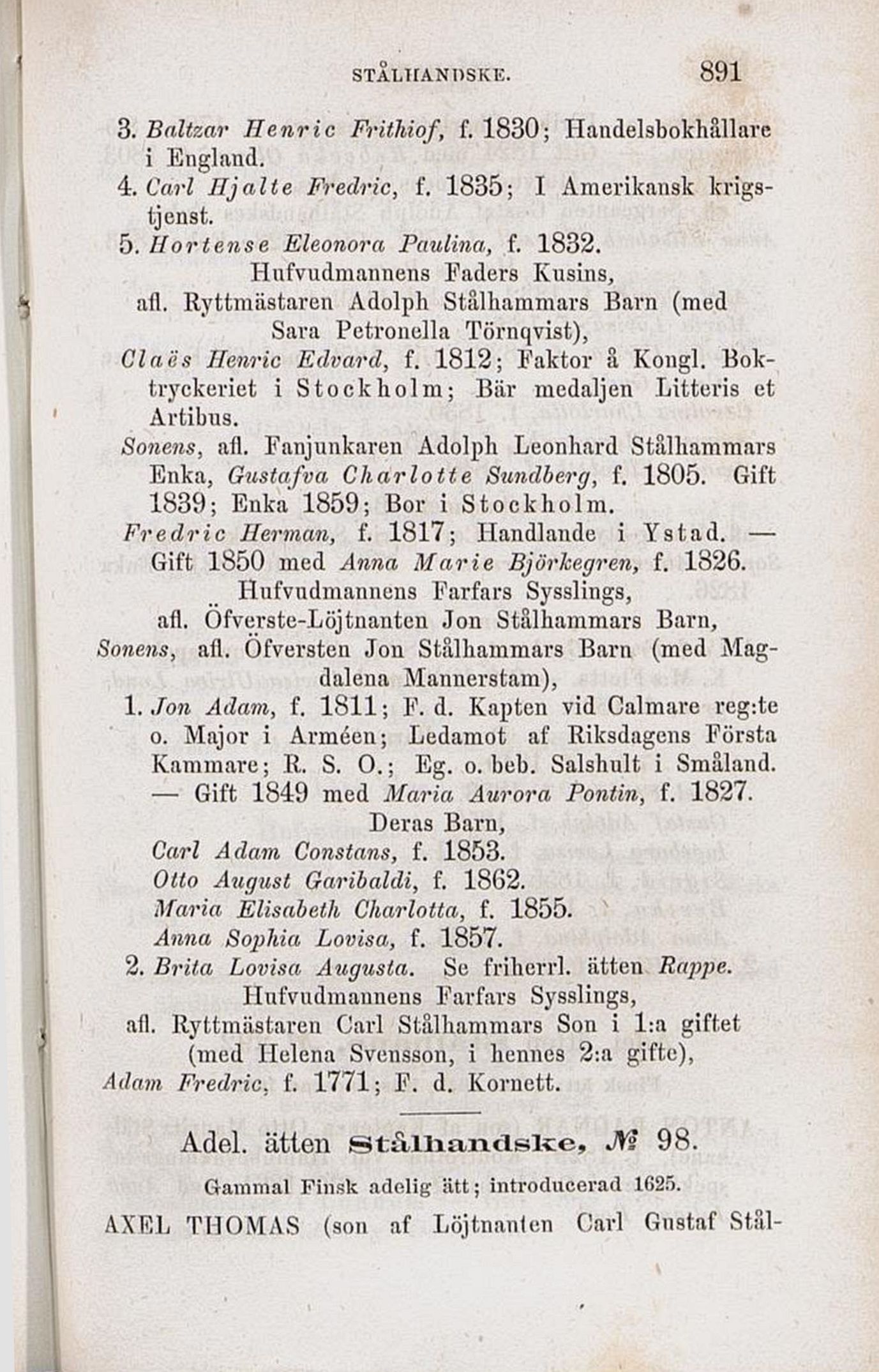 1. Jon Adam, f. 1811; F. d. Kapten vid Calmare reg:te
