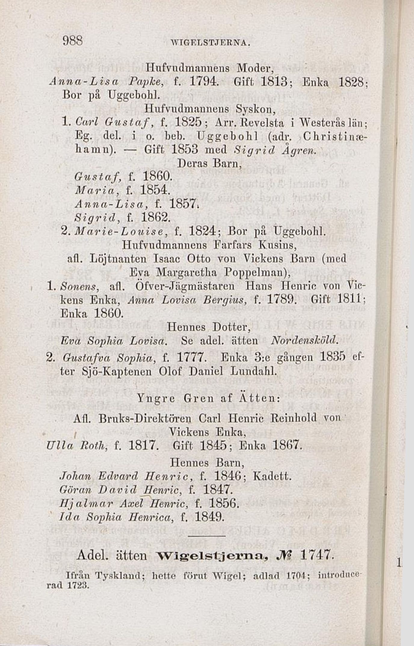 Ifrån Tyskland: hette förut Wigel; adlad 1701; introdace