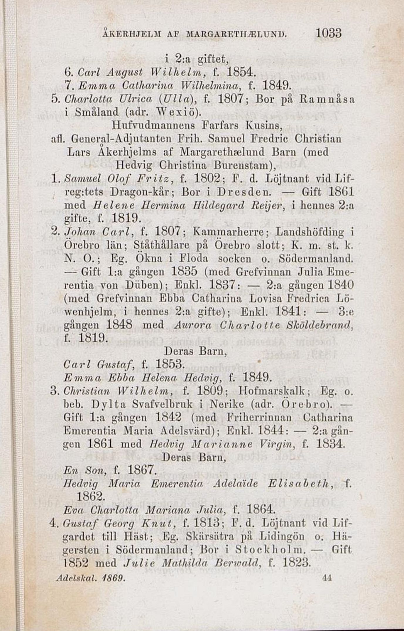 Löwenhjelm, i hennes 2:a gifte); Enkl. 1841: — 3:e