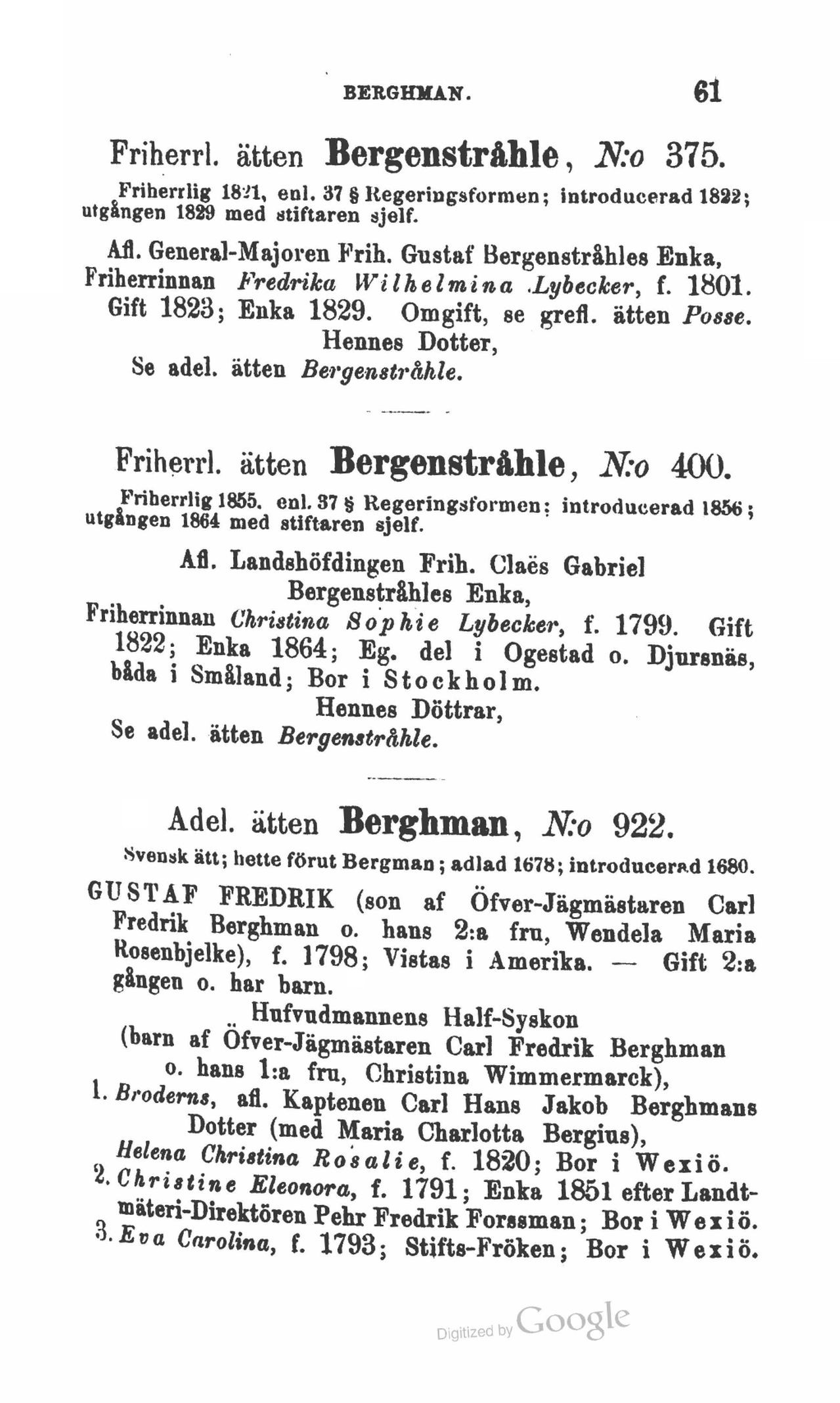 Svensk ätt; hette förut Bergman ; adlad 1678; introducerad 1680.