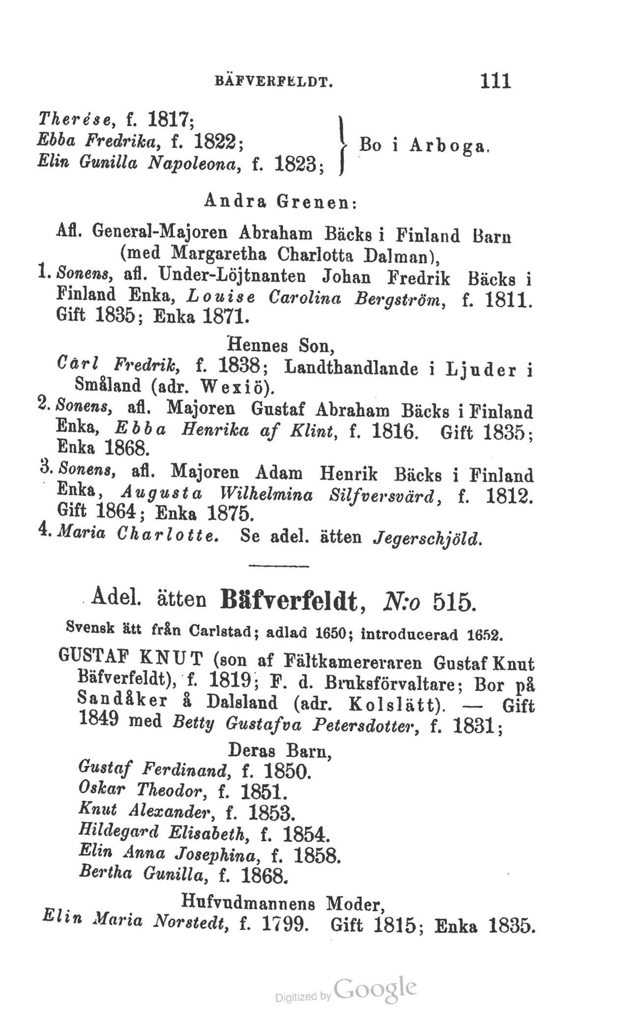 Bäfverfeldt), f. 1819; F. d. Bruksförvaltare; Bor på