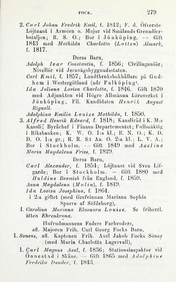 2. Carl Johan Fredrik Emil, t’. 1812; F. cl. Öfverste