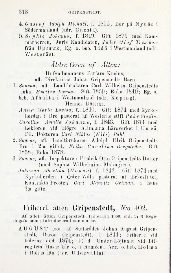 Gripenstedt, Harön Gripenstedt), f. 1814; Friherre vid