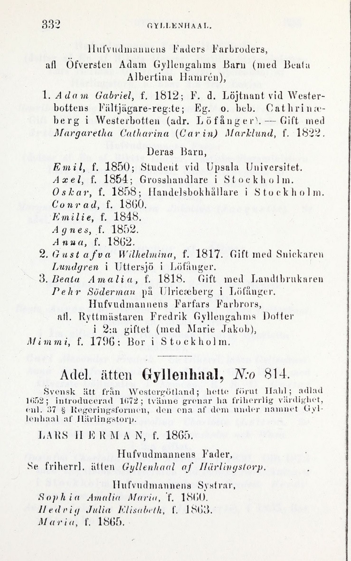 1. Adam Gabriel, f. 1812; F. d. Löjtnant vid