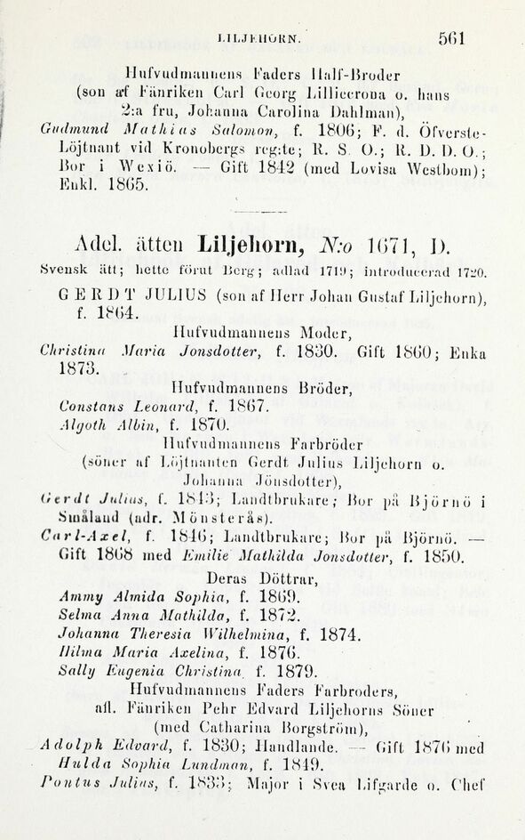 Adel. ätten Liljehorn, N:o 1071, 1).
