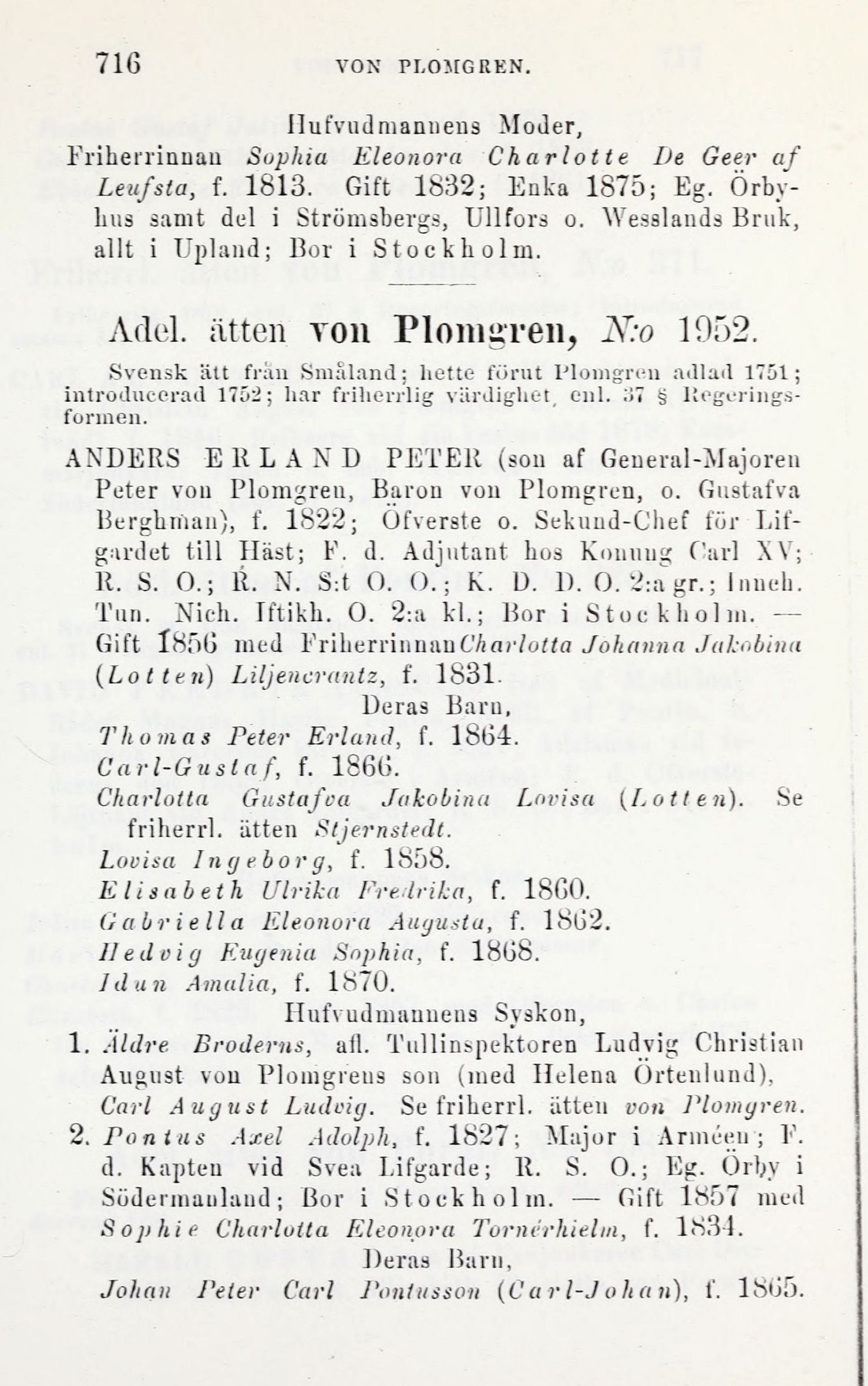 Adel. ätten ron Plomgren, N:o 1952.