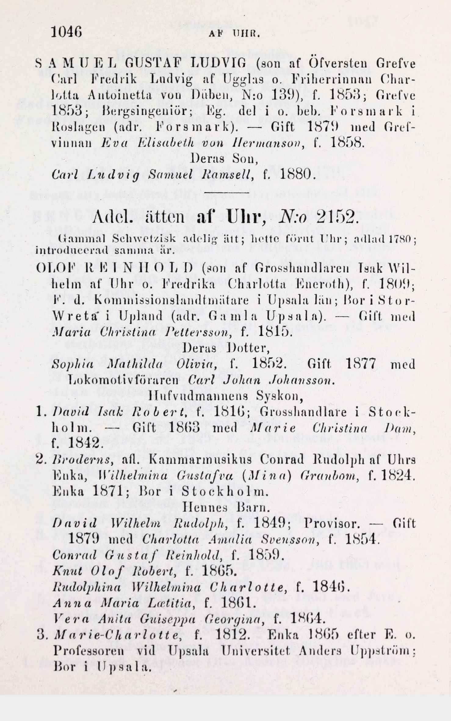 Wilhelm af Uhr o. Fredrika Charlotta Eneroth), f. 1809;
