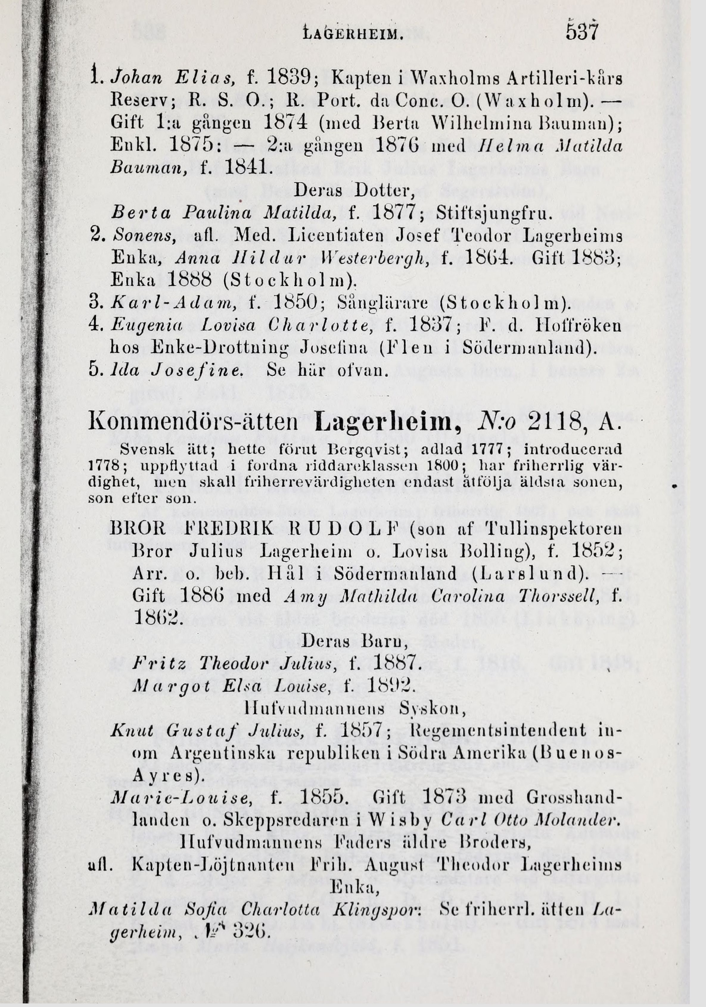 1. Johan Elias, f. 1839; Kapten i Waxholms Artilleri-kårs