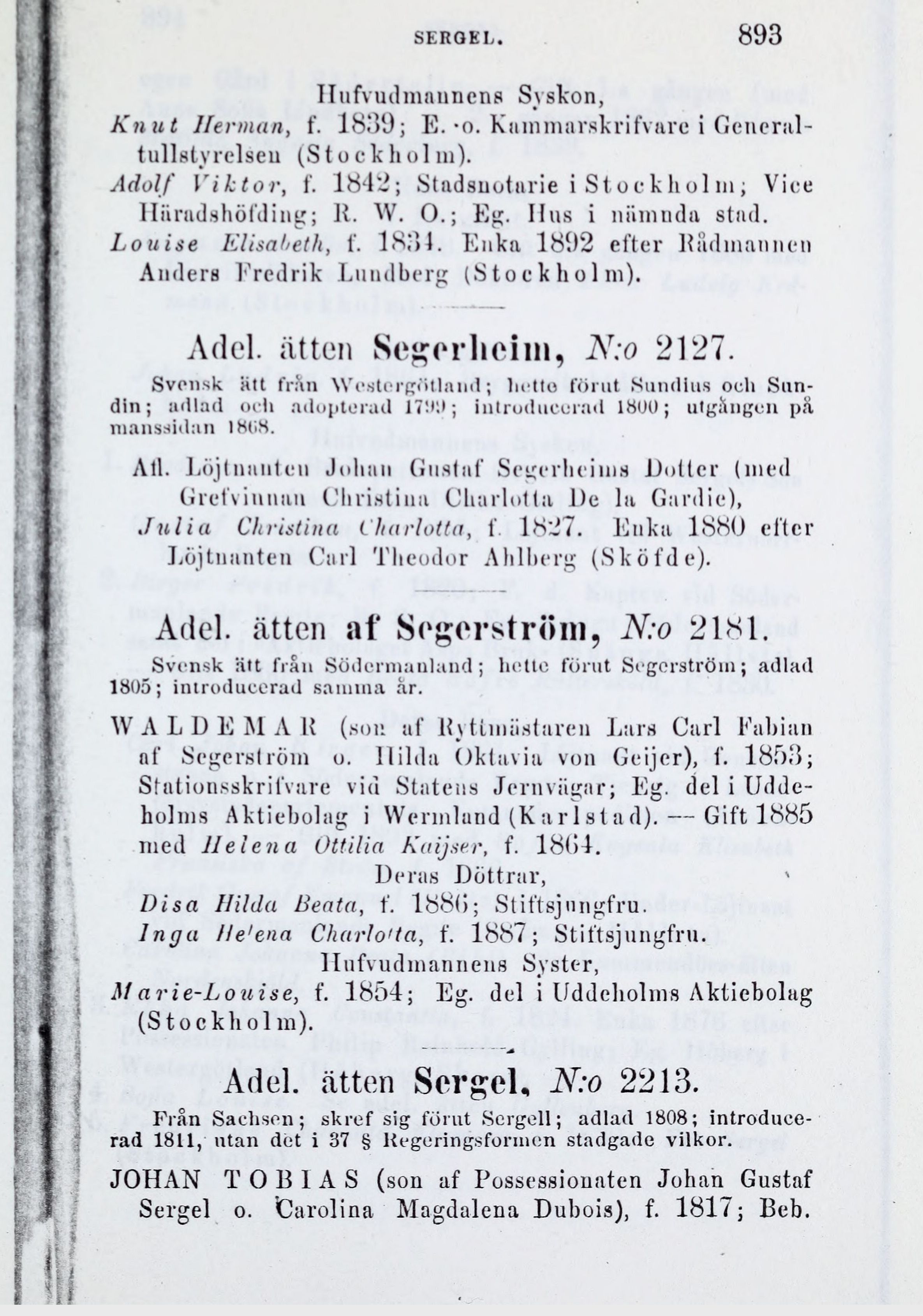 Adel. ätten af Segerström, N:o 2181.