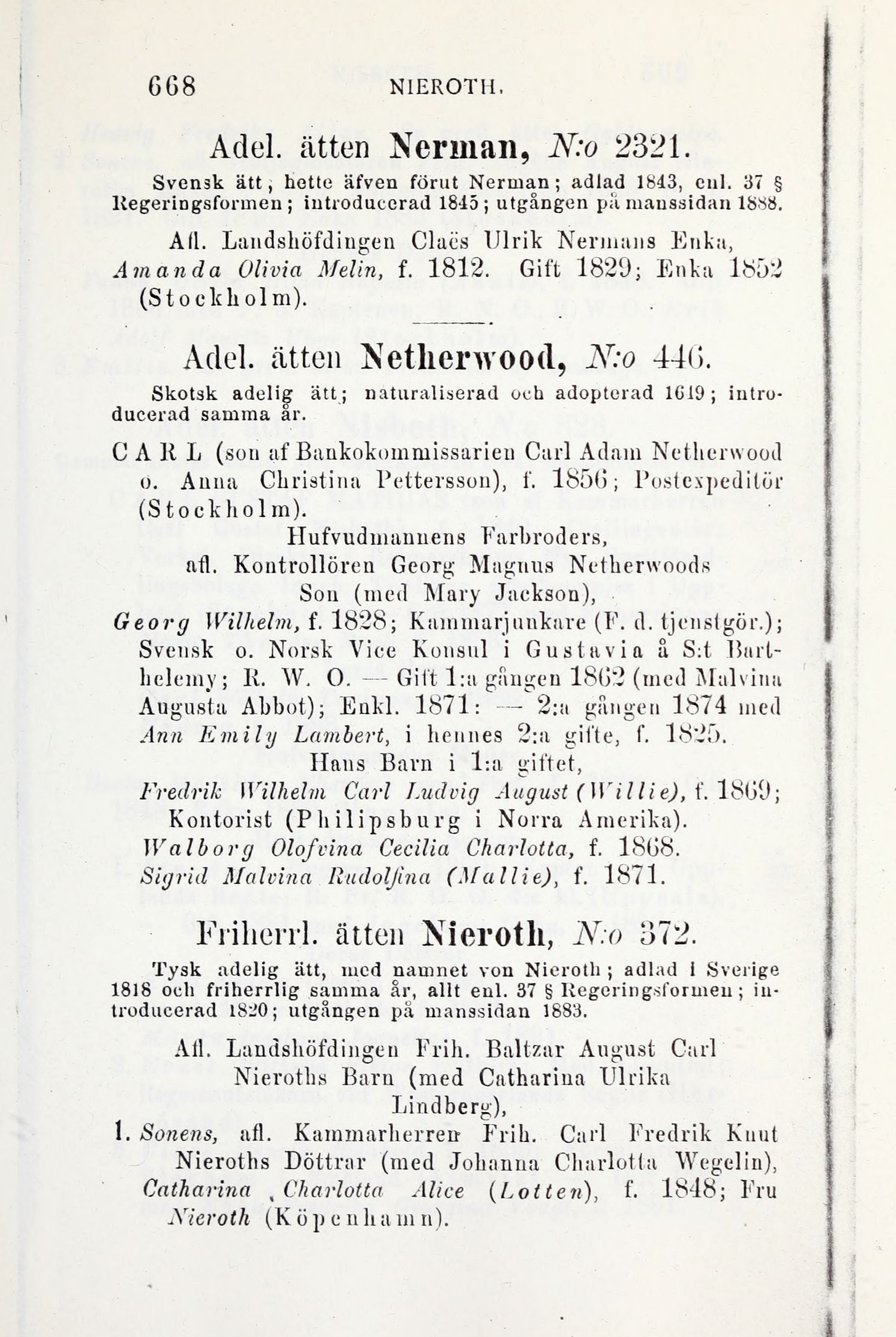 Svensk ätt, hette äfven förut Nerman; adlad 1843, enl. 37 §