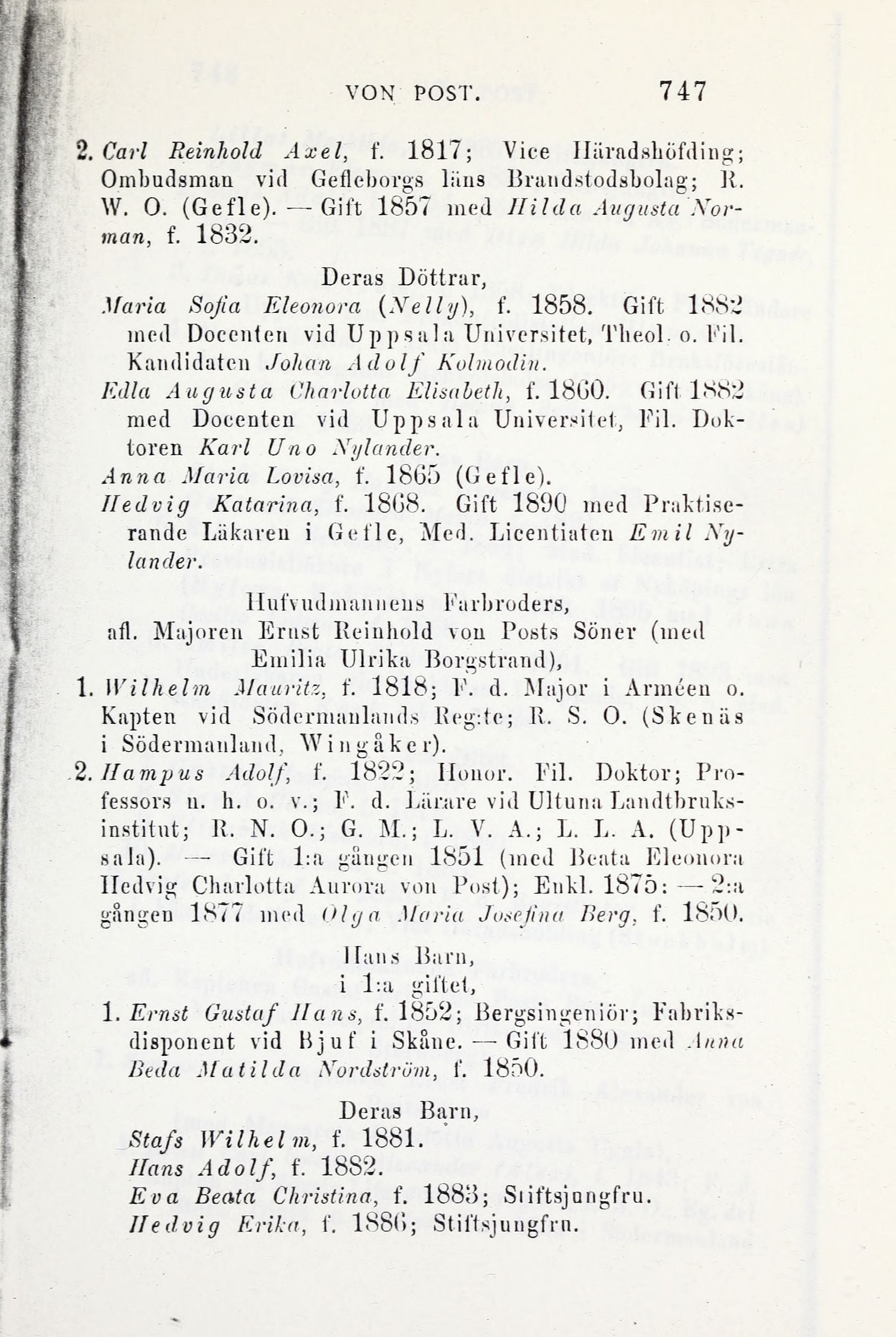 Hedvig Charlotta Aurora von Post); Enkl. 1875:— 2:a