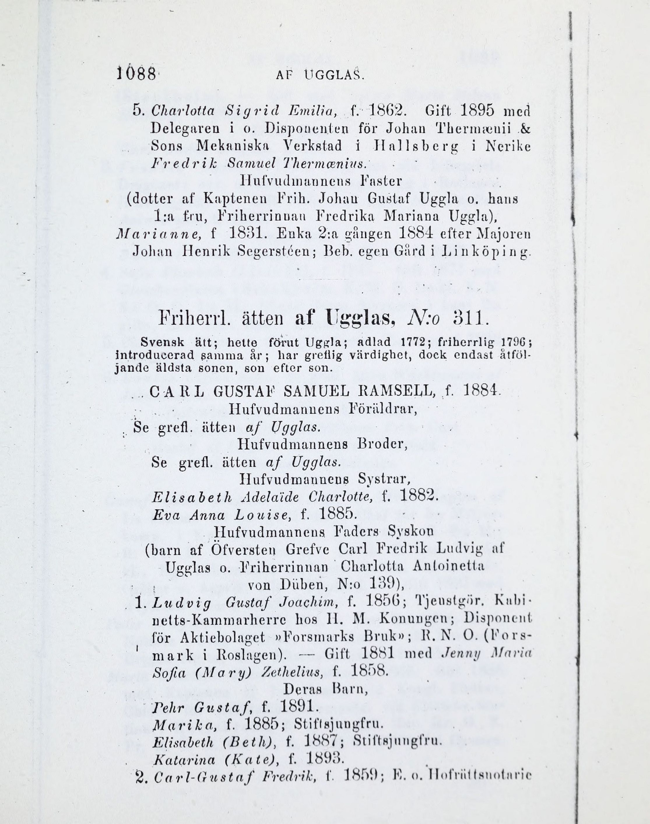 Svensk ätt; hette förut Uggla; adlad 1772; friherrlig 1796;