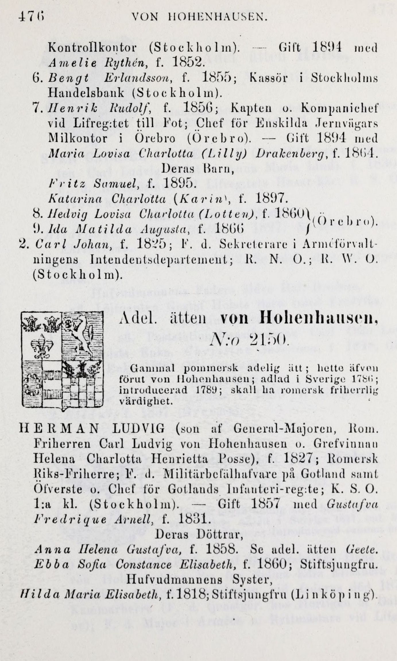 förut von Hohenhausen; adlad i Sverige 17Sii;