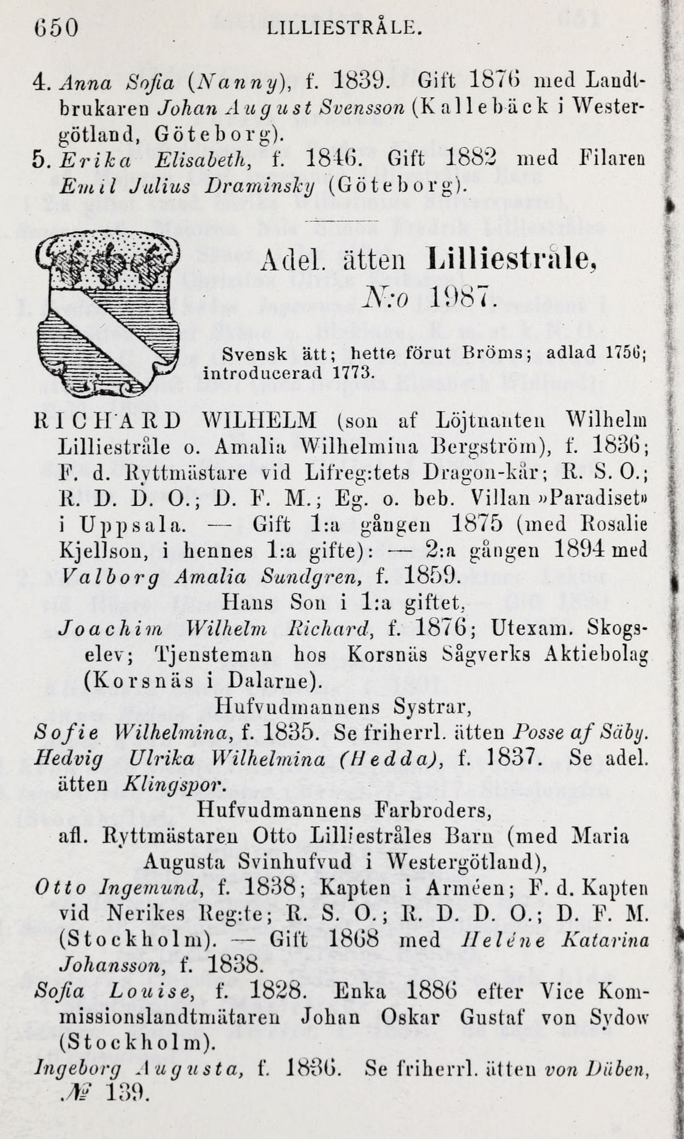 Lilliestråle o. Amalia Wilhelmina Bergström), f. 1836;