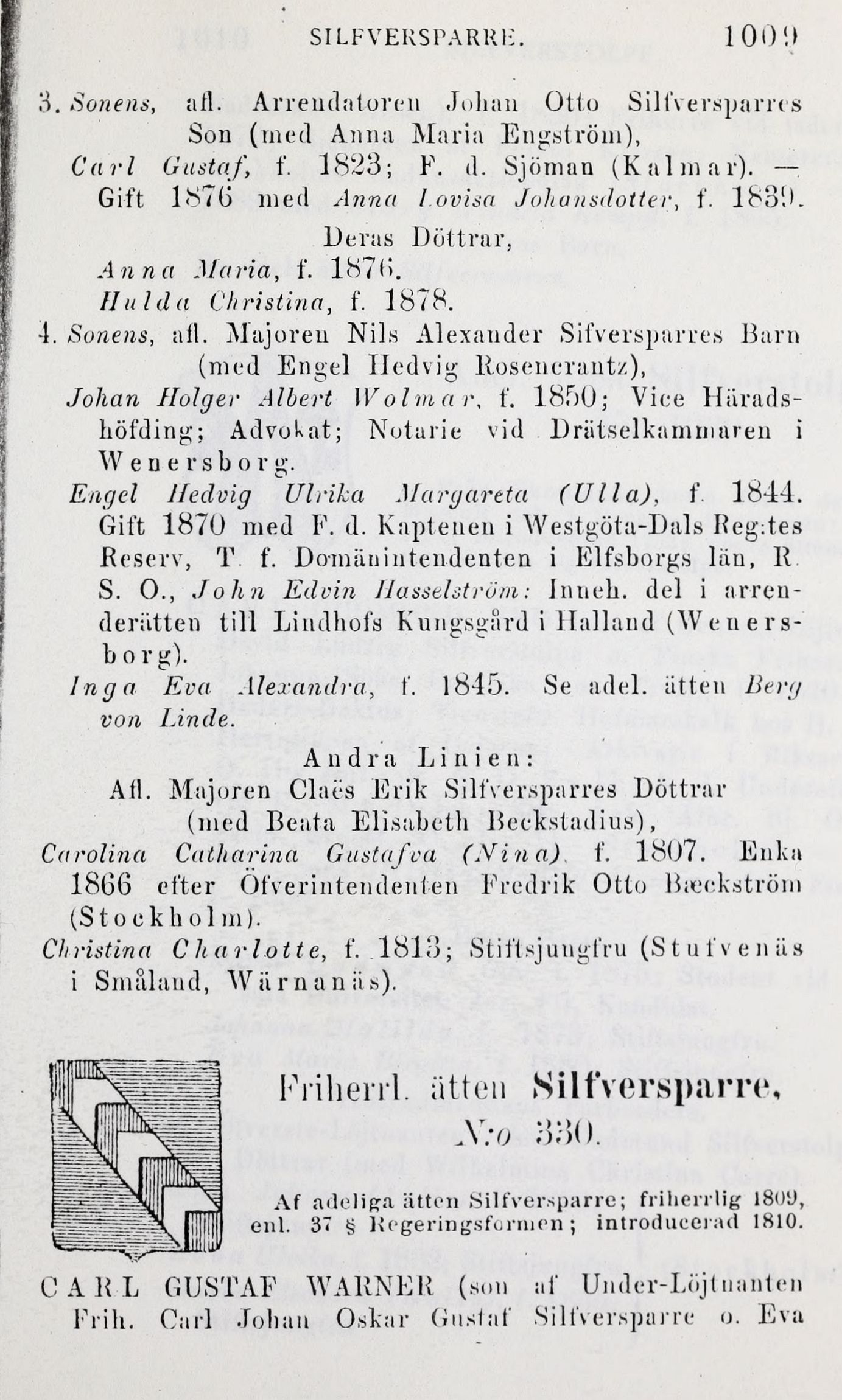 Af adeliga ätten Silfversparre; friherrlig 180’J,