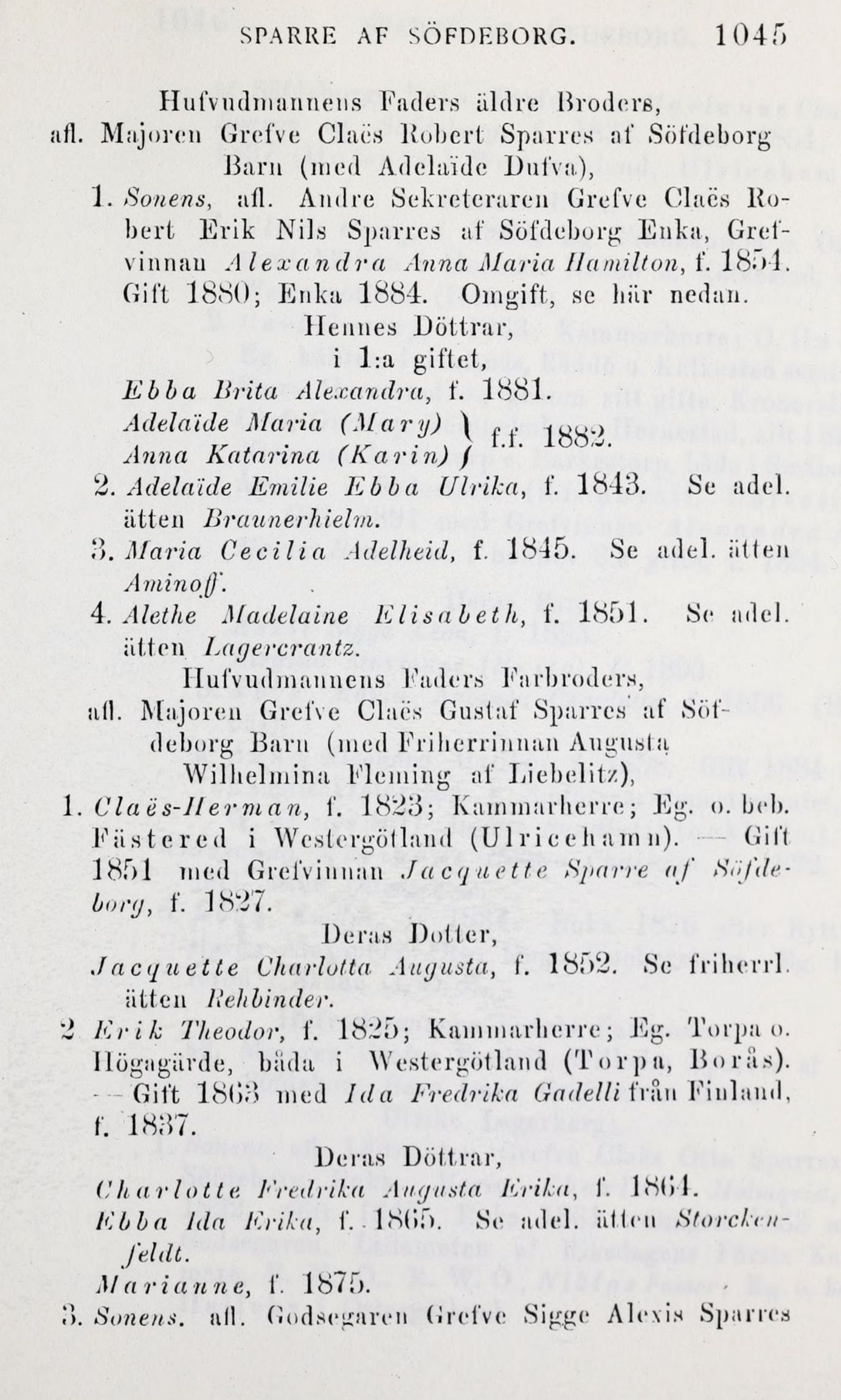 2 Erik Theodor, f. 1825; Kammarherre; F]g. Torpa o.