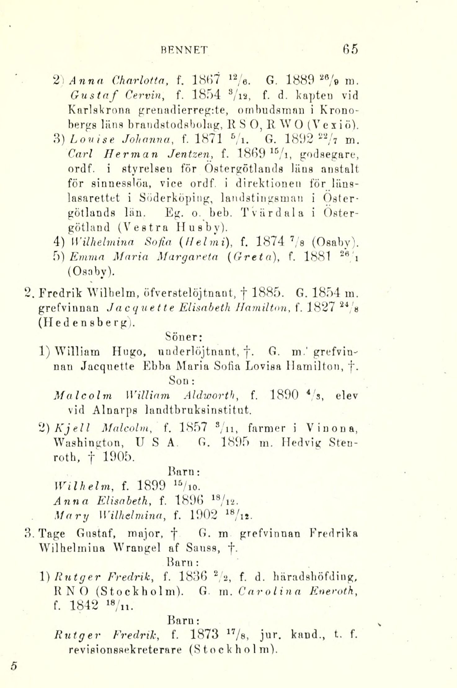 2. Fredrik Wilhelm, öfverstelöjtnant, † 1885. G. 1854 ra.