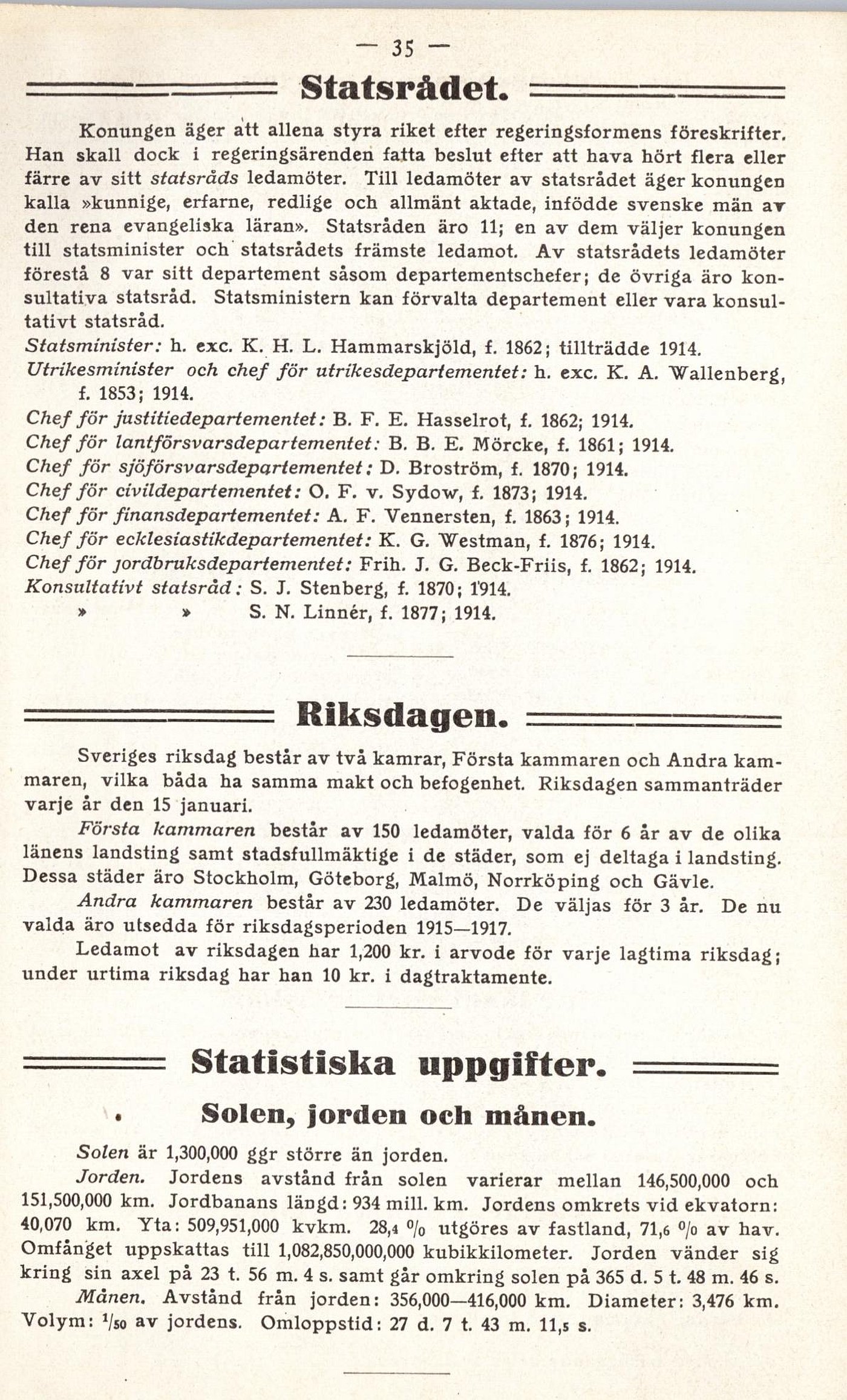 Statsminister: h. exe. K. H. L. Hammarskjöld, f. 1862; tillträdde 1914.