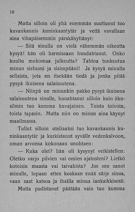 — Kuka olet? hän oli kysynyt veikistellen: