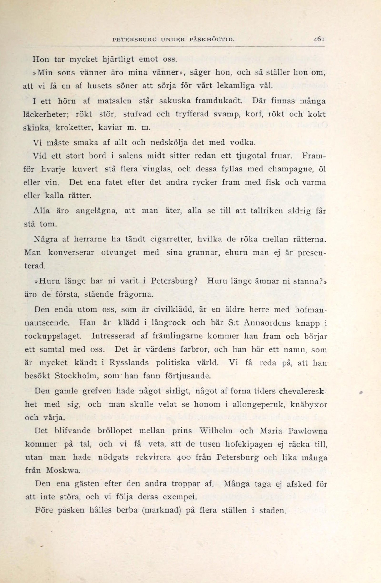 »Huru länge har ni varit i Petersburg? Huru länge ämnar ni stanna?»