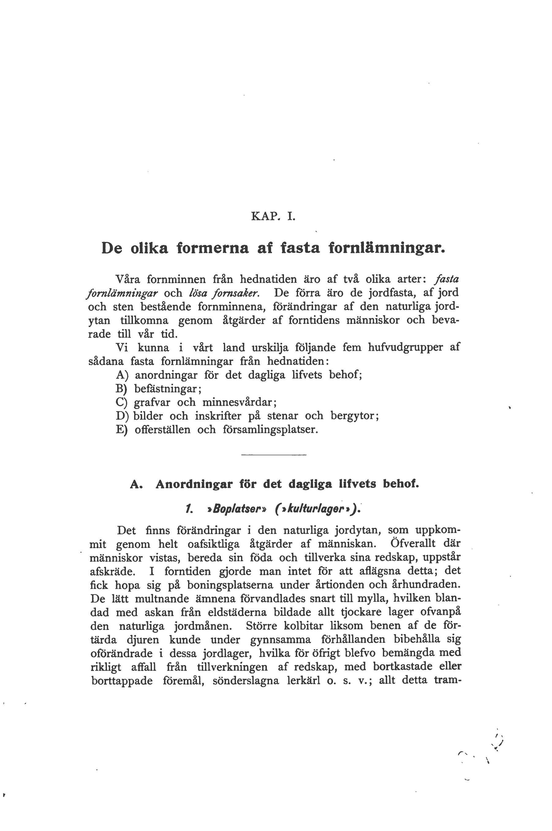 fornlämningar och lösa fornsaker. De förra äro de jordfasta, af jord