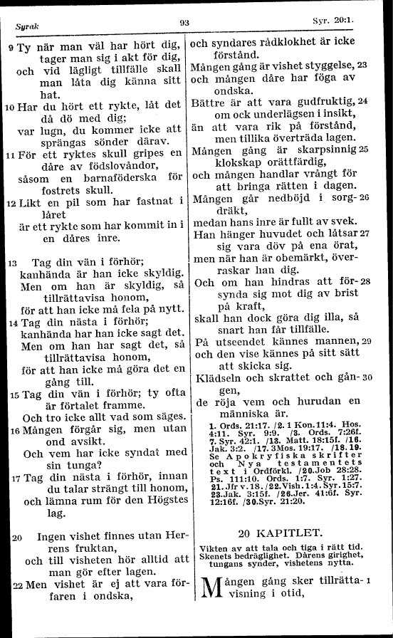 Full resolution (TIFF) - On this page / på denna sida - 19 KAPITLET. Följden av ett besinningslöst levnadssätt. Det onda ryktet. Äkta och falsk vishet. - 20 KAPITLET. Vikten av att tala och tiga i rätt tid. Skenets bedräglighet. Dårens girighet, tungans synder, vishetens nytta.