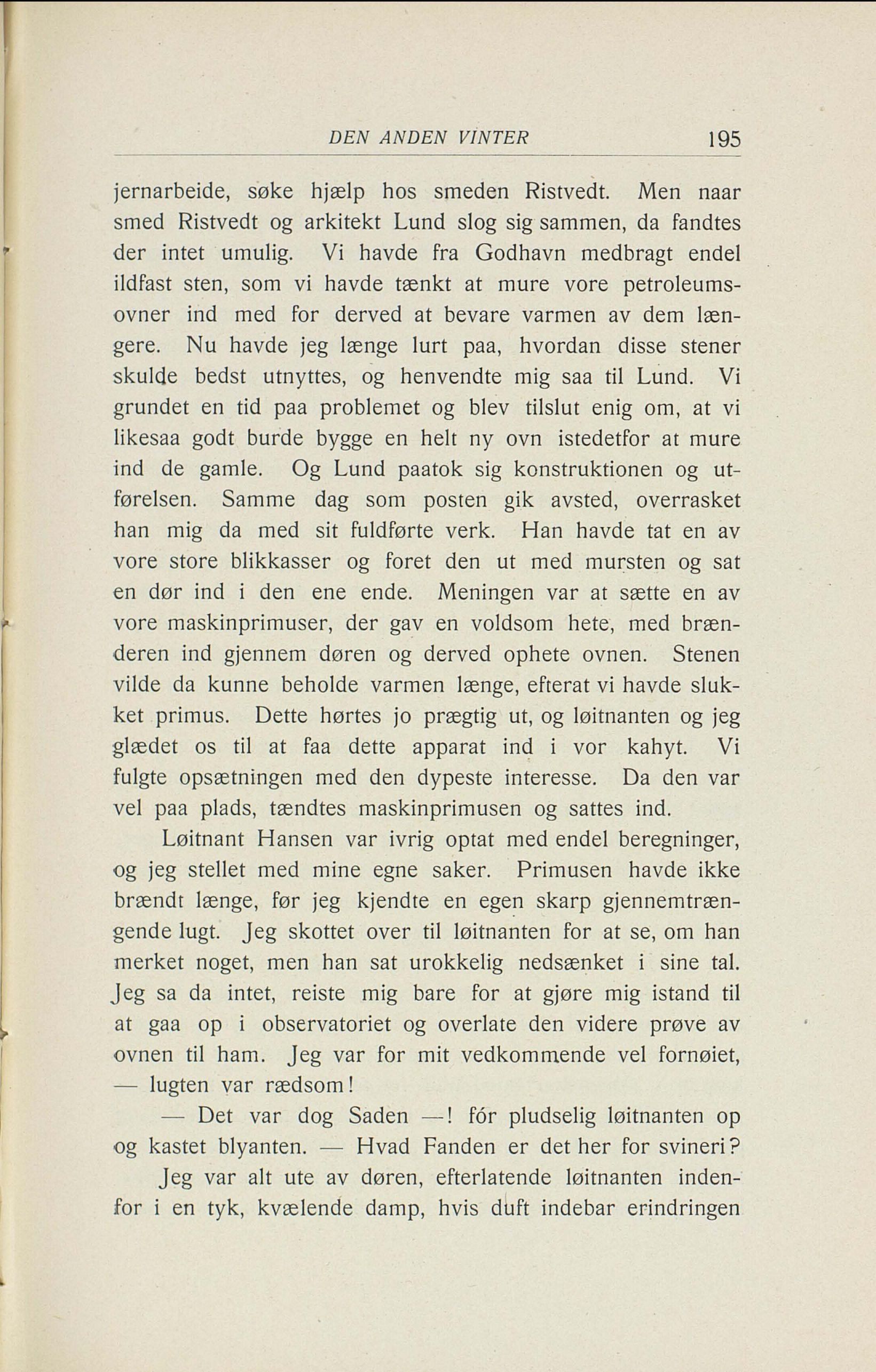 slukket primus. Dette hørtes jo prægtig ut, og løitnanten og jeg