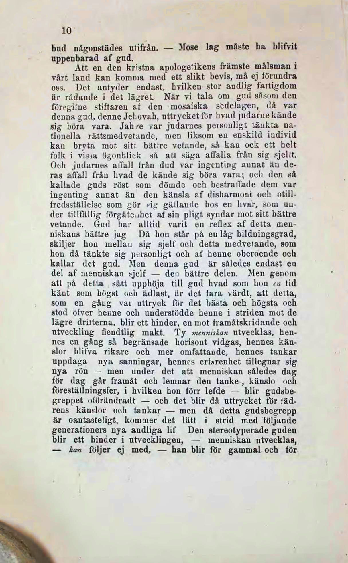 Att en den kristna apologetikens främste målsman i vårt land kan komma med ett slikt bevis, må ej förundra oss. Det antyder endast, hvilken stor andlig fattigdom är rådande i det lägret. När vi tala om gud såsom den föregifne stiftaren at den mosaiska sedelagen, då var denna gud, denne Jehovah, uttrycket för hvad judarne kände sig böra vara. Jahve var judarnes personligt tänkta nationella rättsmedvetande, men liksom en enskild individ kan bryta mot sitt bättre vetande, så kan ock ett helt folk i vissa ögonblick så att säga affalla från sig sjelft. Och judarnes affall från gud var ingenting annat än deras affall från hvad de kände sig böra vara; och den så kallade guds röst som dömde och bestraffade dem var ingenting annat än den känsla af disharmoni och otillfredsställelse som gör sig gällande hos en hvar, som under tillfällig förgätenhet af sin pligt syndar mot sitt bättre vetande. Gud har alltid varit en reflax af detta menniskans bättre jag. Då hon står på en låg bildningsgrad, skiljer hon mellan sig sjelf och detta medvetande, som hon då tänkte sig personligt och af henne oberoende och kallar det gud. Men denna gud är således endast en del af menniskan sjelf — den bättre delen. Men genom att på detta sätt upphöja till gud hvad som hon en tid känt som högst och ädlast, är det fara värdt, att detta, som en gång var uttryck för det bästa och högsta och stod öfver henne och understödde henne i striden mot de lägre drifterna, blir ett hinder, en mot framåtskridande och utveckling fiendtlig makt. Ty menniskan utvecklas, hennes en gång så begränsade horisont vidgas, hennes känslor blifva rikare och mer omfattande, hennes tankar uppdaga nya sanningar, hennes erfarenhet tillegnar sig nya rön — men under det att menniskan således dag för dag går framåt och lemnar den tanke-, känslo- och föreställningsfer, i hvilken hon förr lefde — blir gudsbegreppet oförändradt — och det blir då uttrycket för fädrens känslor och tankar — men då detta gudsbegrepp är oantasteligt, kommer det lätt i strid med följande generationers nya andliga lif. Den stereotyperade guden blir ett hinder i utvecklingen, — menniskan utvecklas, — han följer ej med, — han blir för gammal och för