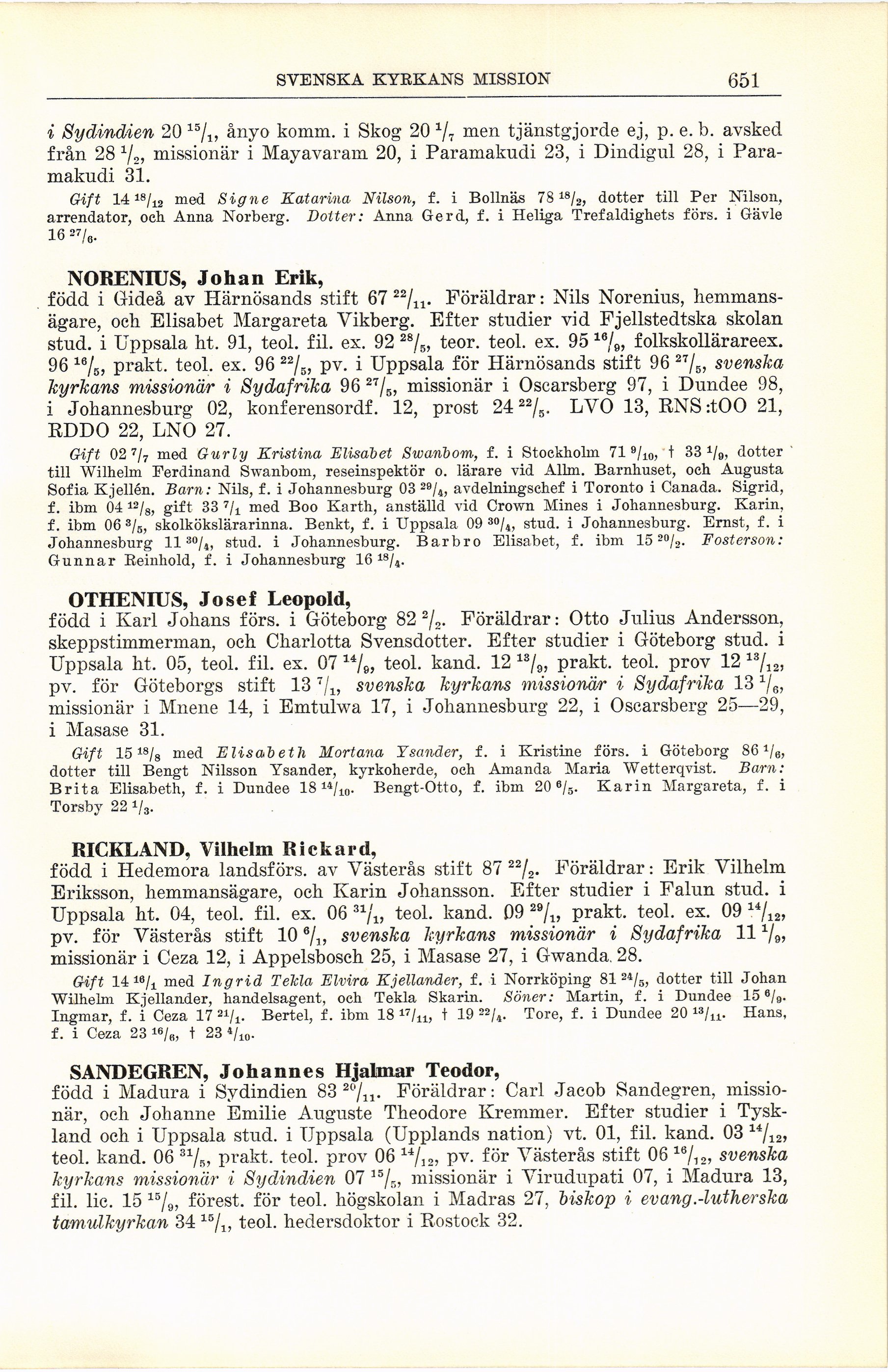 fil. lic. 15 15/9, förest, för teol. högskolan i Madras 27, biskop i ev ang.-lutherska