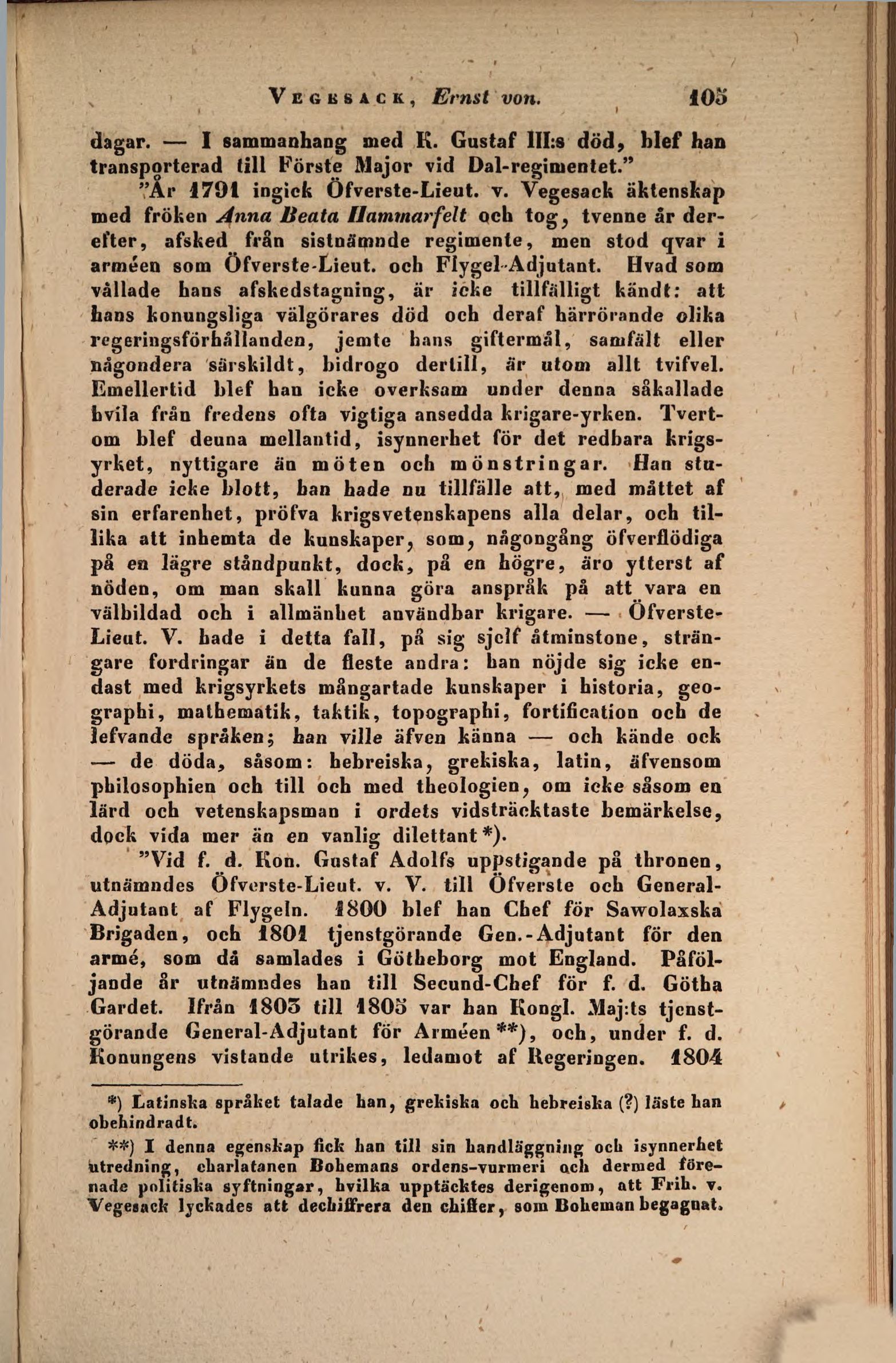 "År 1791 ingick Öfverste-Lieut. v. Vegesack äktenskap