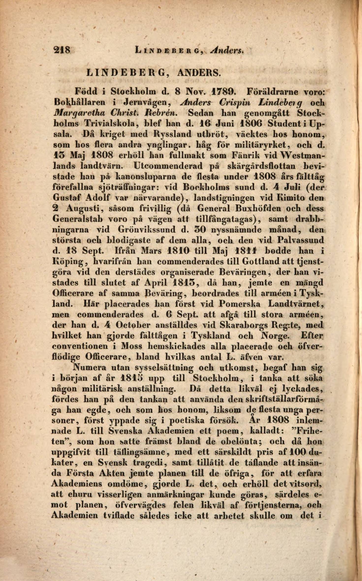 Född i Stockholm d. 8 Nov. 1789. Föräldrarne voro: