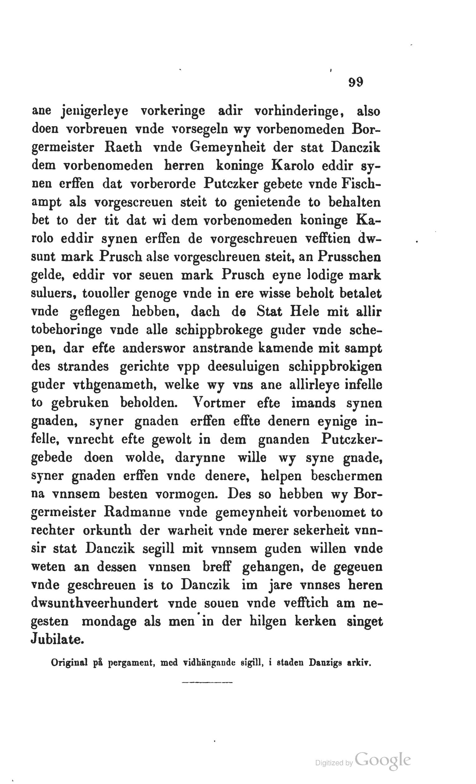 Original pä pergament, med vidhängande sigill, i staden Danzigs arkiv.