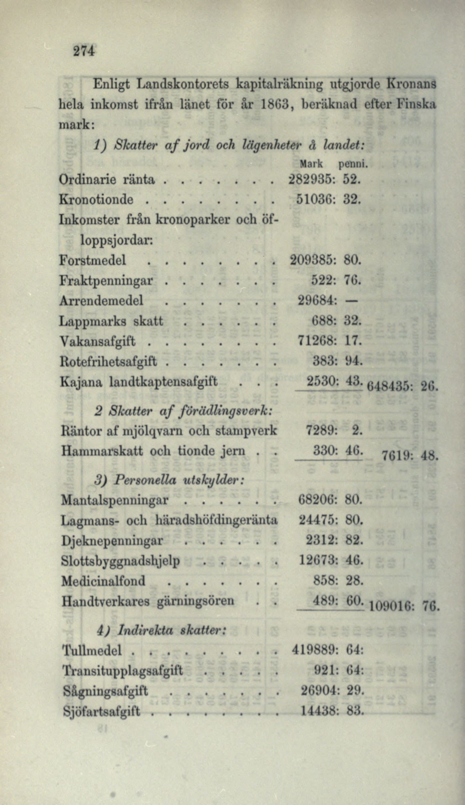 bela inkomst ifrån länet för år 1863, beräknad efter Finska